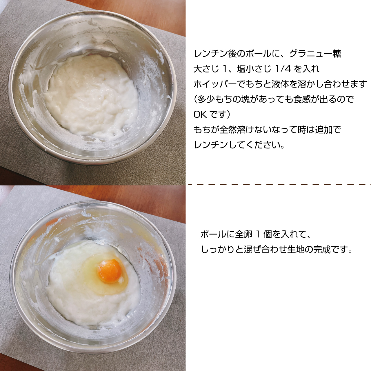 ②レンチン後のボールに、グラニュー糖大さじ1、塩小さじ1/4を入れホイッパーでもちと液体を溶かし合わせます(多少もちの塊があっても食感が出るのでOKです)
