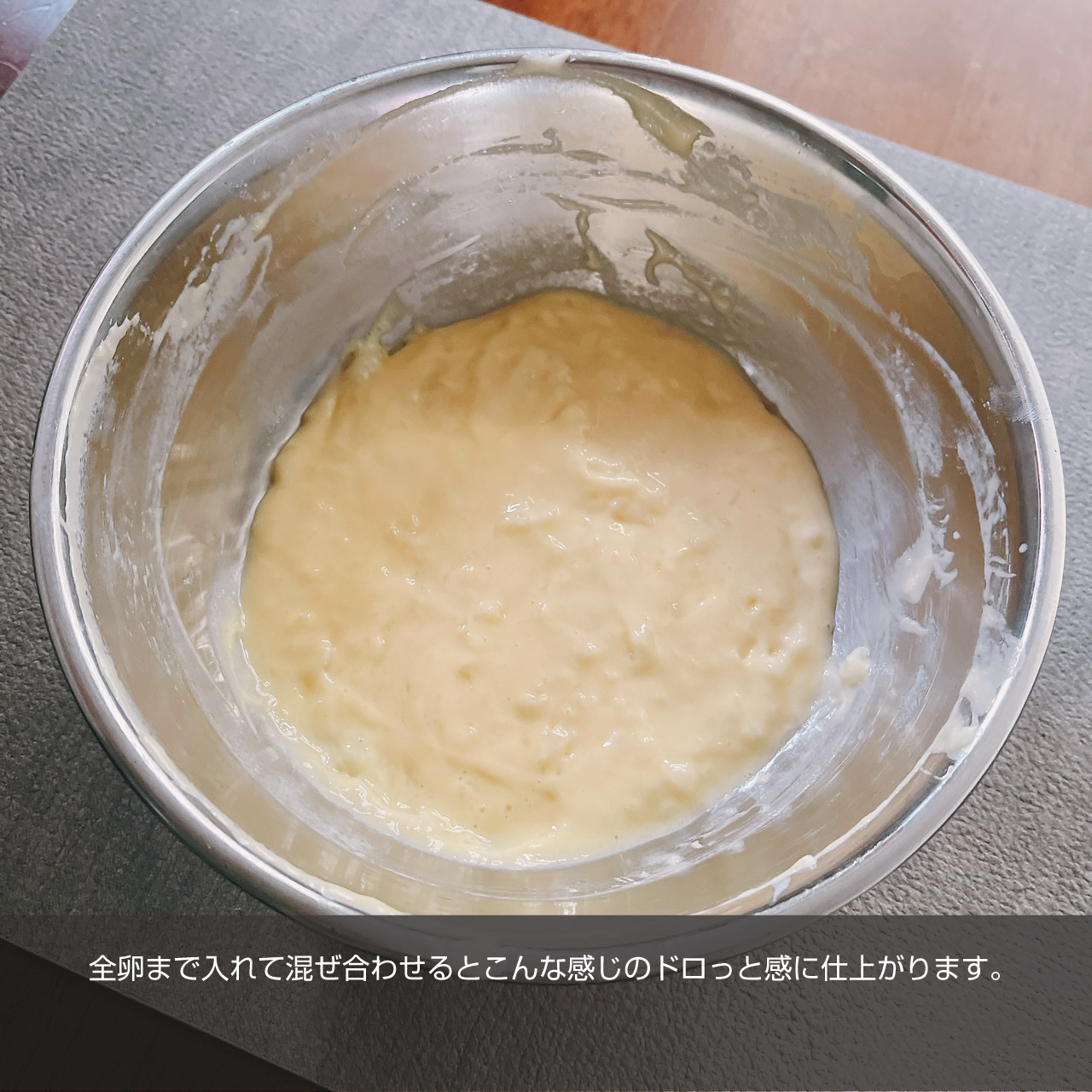 ③ボールに全卵1個を入れて、しっかりと混ぜ合わせ生地の完成です。