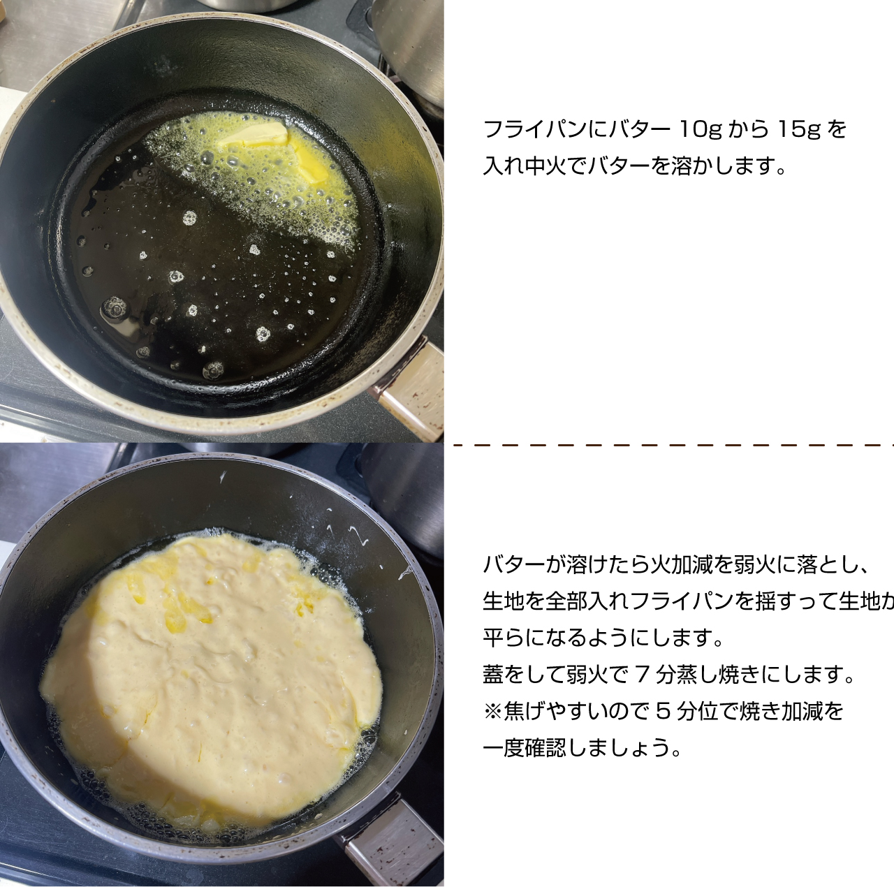 ④フライパンにバター10gから15gを入れ中火でバターを溶かします。バターが溶けたら火加減を弱火に落とし、生地を全部入れフライパンを揺すって生地が平らになるようにします。