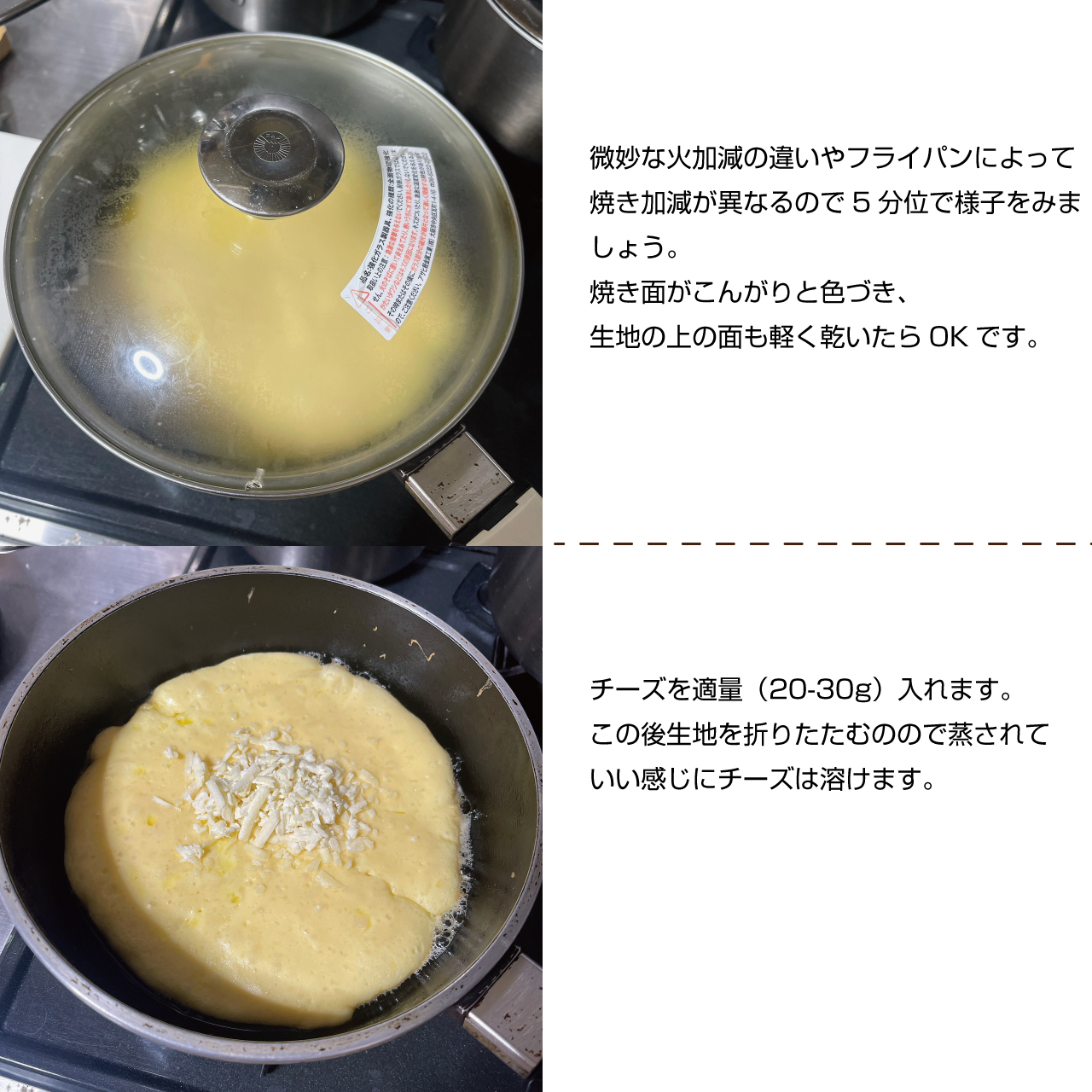 生地は蒸し焼きで7分位焼くのですが、非常に焦げやすいので5分位で焼き加減を一度確認しましょう。足りなければもう少し焼き、十分な焼き目がついたら次の工程へ。