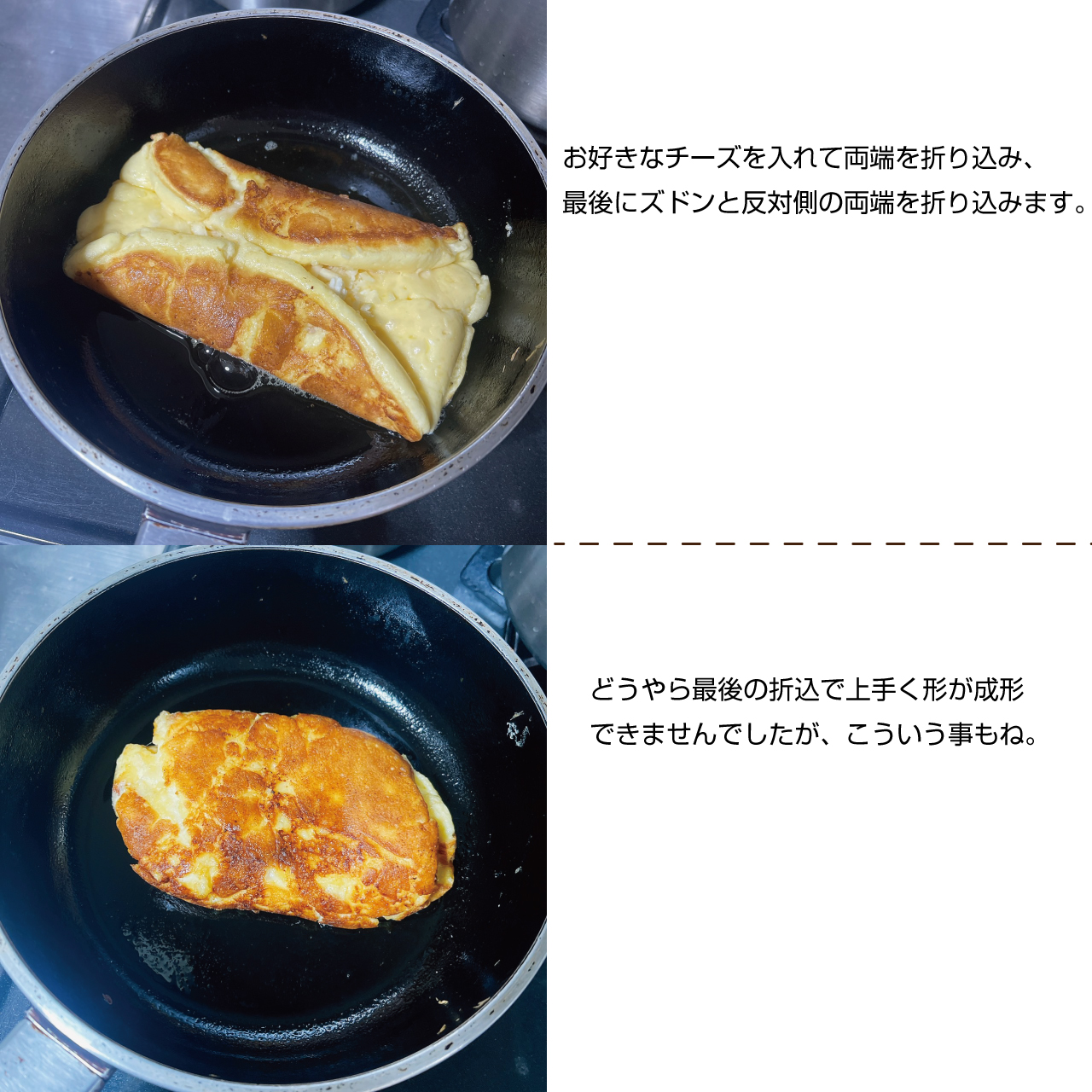 ⑤焼き面がこんがりと色づき、生地の上の面も軽く乾いたらOKです。お好きなチーズを入れて両端を折り込み、最後にズドンと反対側の両端を折り込みます。