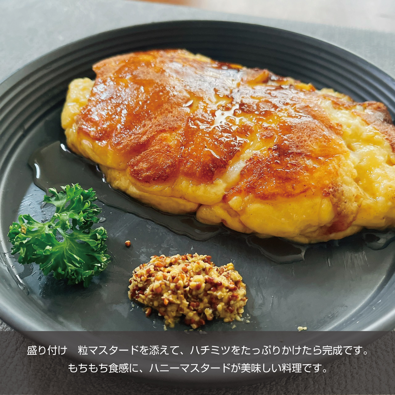 ⑥盛り付け 粒マスタードを添えて、ハチミツをたっぷりかけたら完成です。