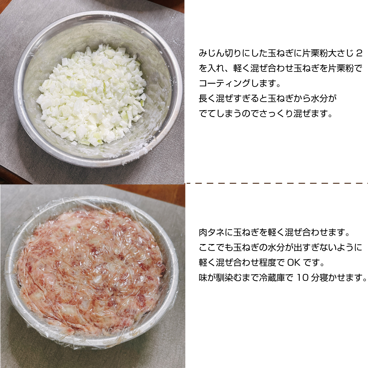 ⑤ ③の肉タネに④の玉ねぎを軽く混ぜ合わせます。ここでも玉ねぎの水分が出すぎないように軽く混ぜ合わせ程度でOKです。味が馴染むまで冷蔵庫で10分寝かせます。