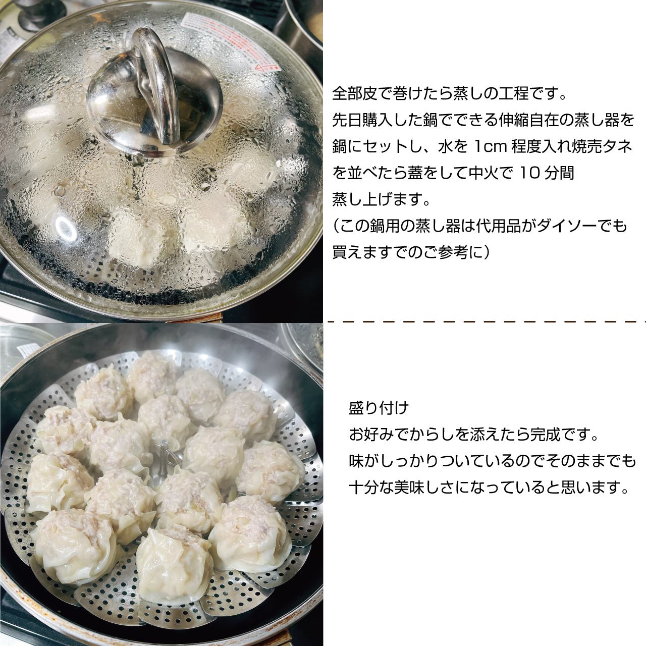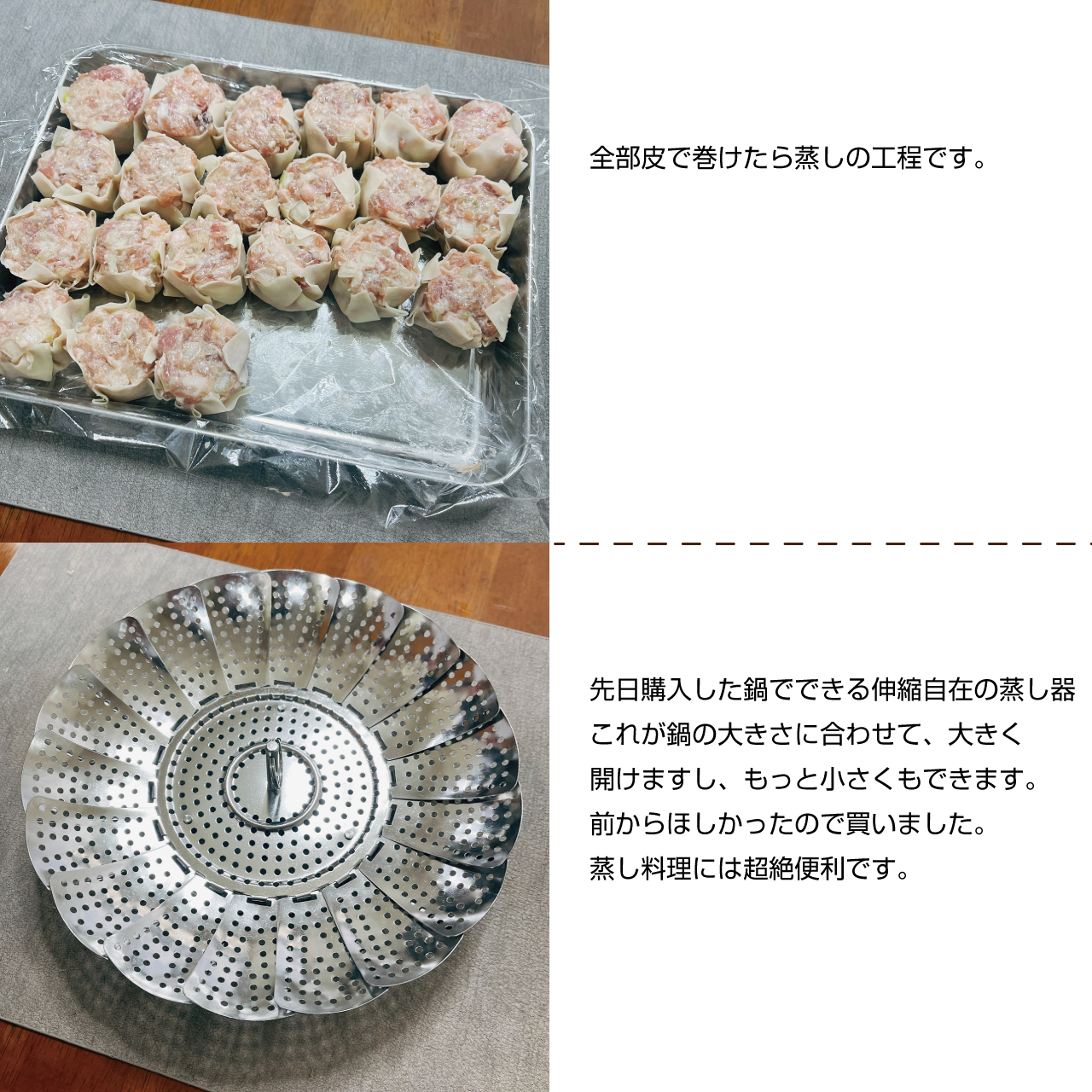 ⑦全部皮で巻けたら蒸しの工程です。先日購入した鍋でできる伸縮自在の蒸し器を鍋にセットし、水を1cm程度入れ焼売タネを並べたら蓋をして中火で10分間蒸し上げます。(この鍋用の蒸し器は代用品がダイソーでも買えますでのご参考に)道具買うの嫌だって方は笠原さんの鍋底にキャベツを引いて蒸すのが簡単かと思います。