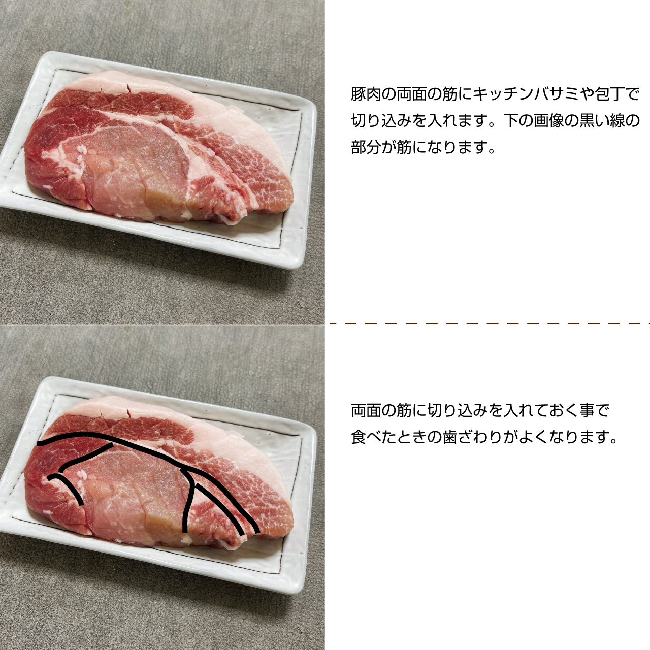 ①豚肉の両面の筋にキッチンバサミや包丁で切り込みを入れます。両面の筋に切り込みを入れておく事で食べたときの歯ざわりがよくなります。