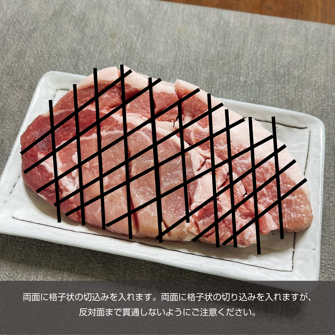 ①豚肉の筋切りをし、格子状に切込みを入れる。