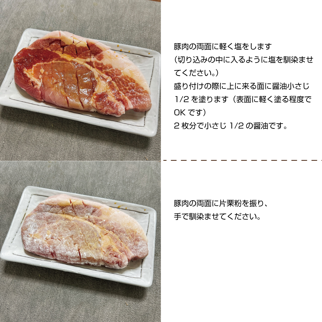 ⑤豚肉の両面に片栗粉を振り、手で馴染ませてください。