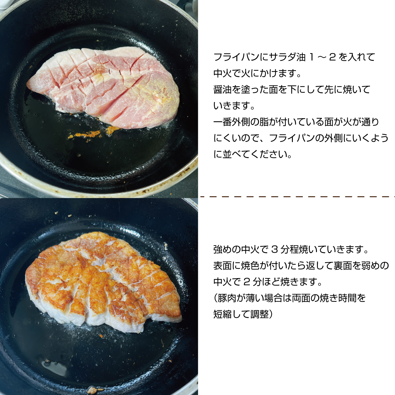 ⑦強めの中火で3分程焼いていきます。表面に焼色が付いたら返して裏面を弱めの中火で2分ほど焼きます。(豚肉が薄い場合は両面の焼き時間を短縮して調整)