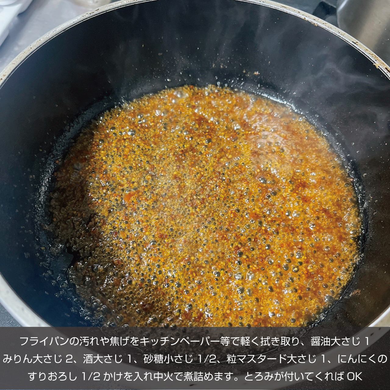 ⑨フライパンの汚れや焦げをキッチンペーパー等で軽く拭き取ってから、醤油大さじ1、みりん大さじ2、酒大さじ1、砂糖小さじ1/2、粒マスタード大さじ1、にんにくのすりおろし1/2掛けを入れて中火で火にかけ煮詰めます。とろみが付いてくればOKです。