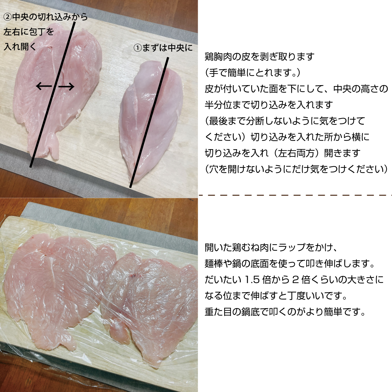 ①鶏胸肉の皮を剥ぎ取ります(手で簡単にとれます。)皮が付いていた面を下にして、中央に高さの半分位まで切り込みを入れます(最後まで分断しないように気をつけてください)切り込みを入れた所から横に切り込みを入れ(左右両方)開きます(穴を開けないようにだけ気をつけください。)