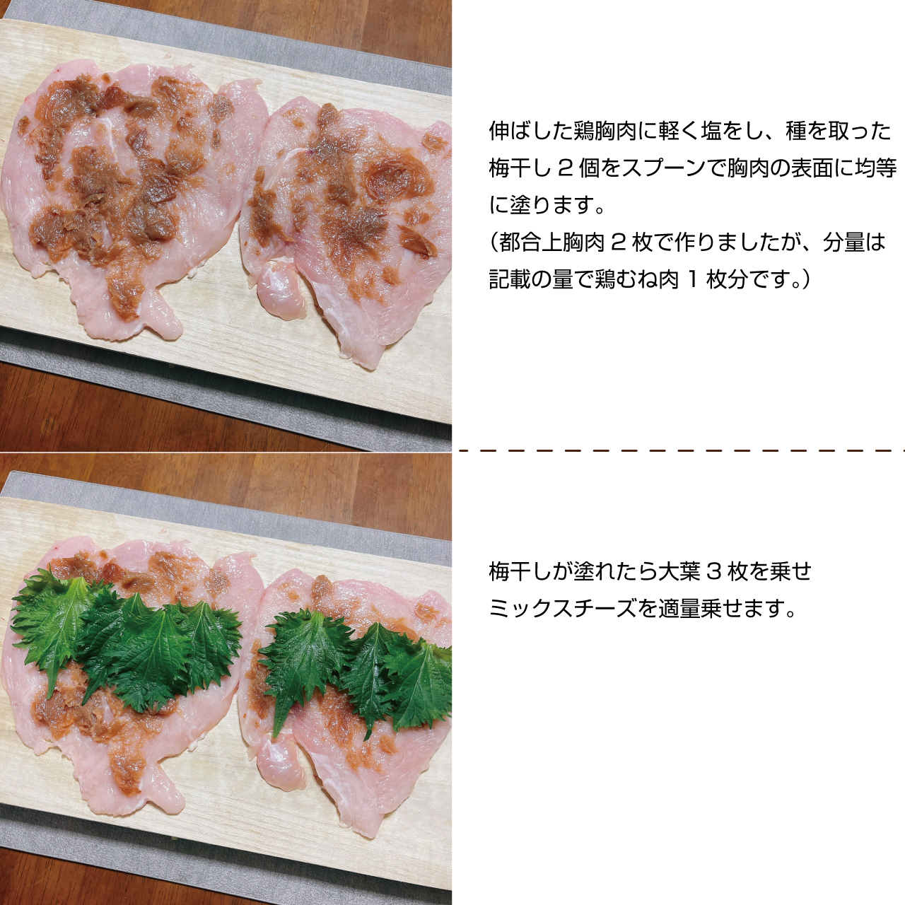 ③伸ばした鶏胸肉に軽く塩をし、種を取った梅干し2個をスプーンで胸肉の表面に均等に塗ります。梅干しが塗れたら大葉3枚を乗せミックスチーズを適量乗せます。