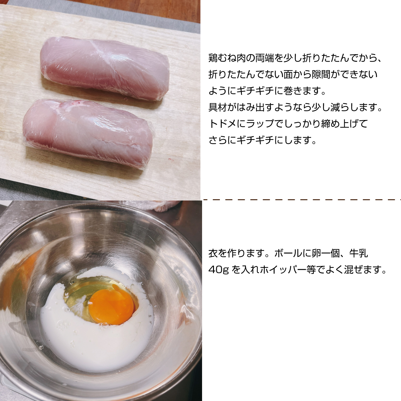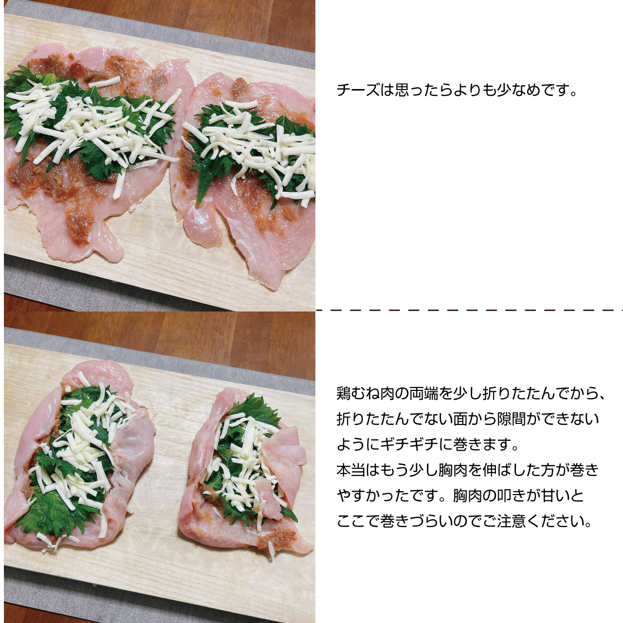 鶏むね肉を開いてからしっかり鍋の底等で叩いて2倍位の大きさにします。梅干し、大葉、チーズを入れて中に余計な空間ができないようにギチギチに巻い、中から具材がはみ出ないようにします。