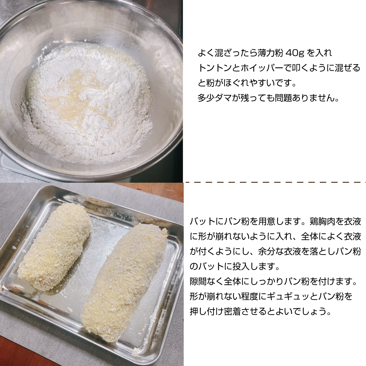 ⑥バットにパン粉を用意します。④の鶏胸肉を⑤の衣液に形が崩れないように入れ、全体によく衣液が付くようにし、余分な衣液を落としパン粉のバットに投入します。
