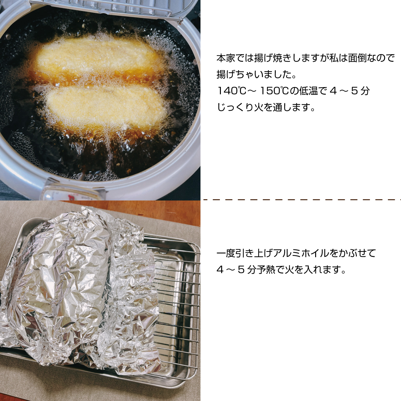 ⑦本家では揚げ焼きしますが私は面倒なので揚げちゃいました。140℃~150℃の低温で4~5分じっくり火を通し、一度引き上げアルミホイルをかぶせて4~5分予熱で火を入れ、170℃で1分外側がカリッとするように二度揚げしました。ここはおうちの道具と相談してお好みでどうぞ。