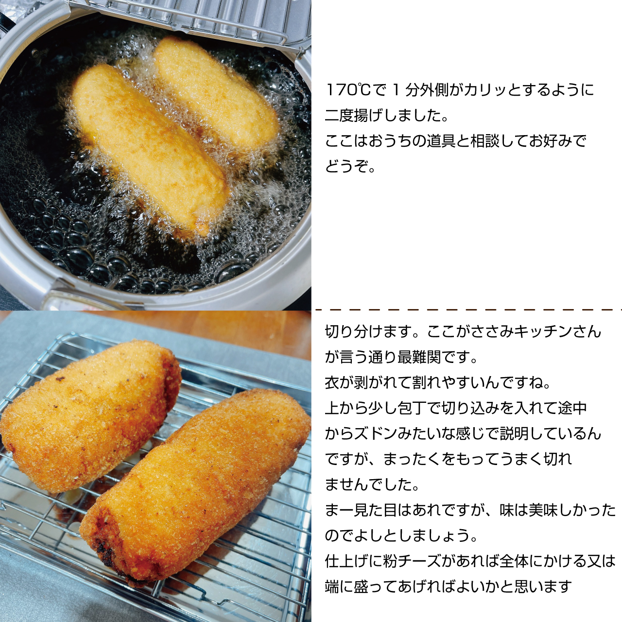 ⑧切り分けます。ここがささみキッチンさんが言う通り最難関です。衣が剥がれて割れやすいんですね。上から少し包丁で切り込みを入れて途中からズドンみたいな感じで説明しているんですが、まったくをもってうまく切れませんでした。まー見た目はあれですが、味は美味しかったのでよしとしましょう。