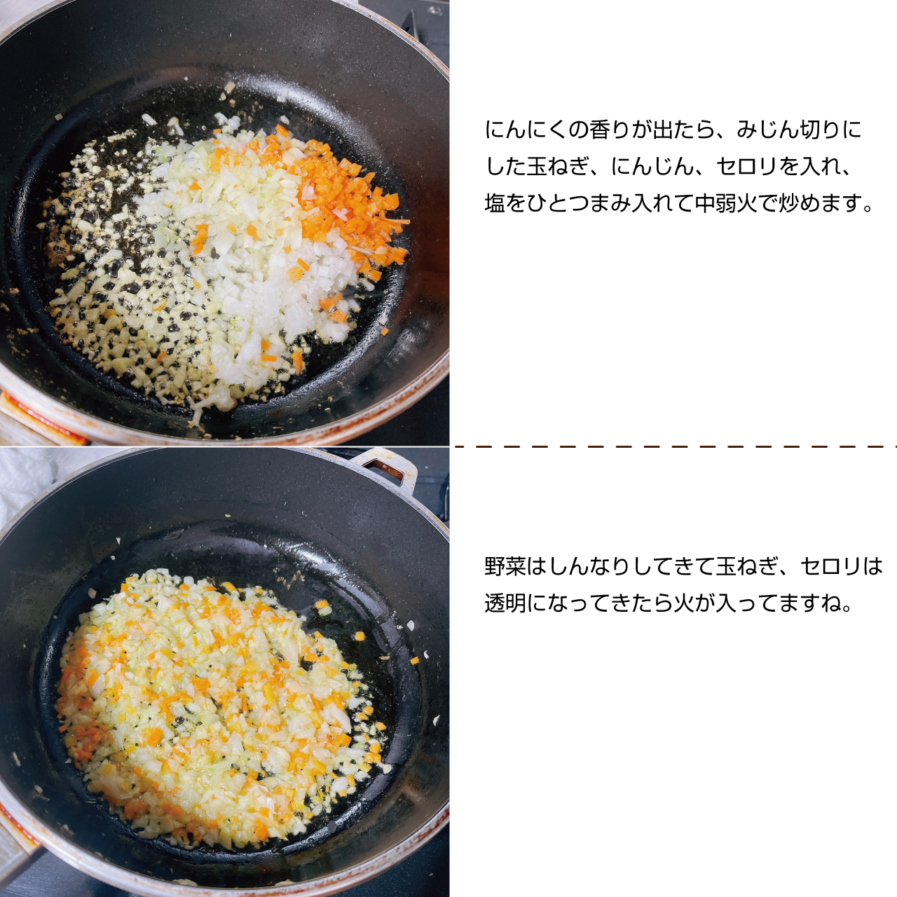 ⑤にんにくの香りが出たら、みじん切りにした玉ねぎ、にんじん、セロリを入れ、塩をひとつまみ入れて中弱火で炒めます。