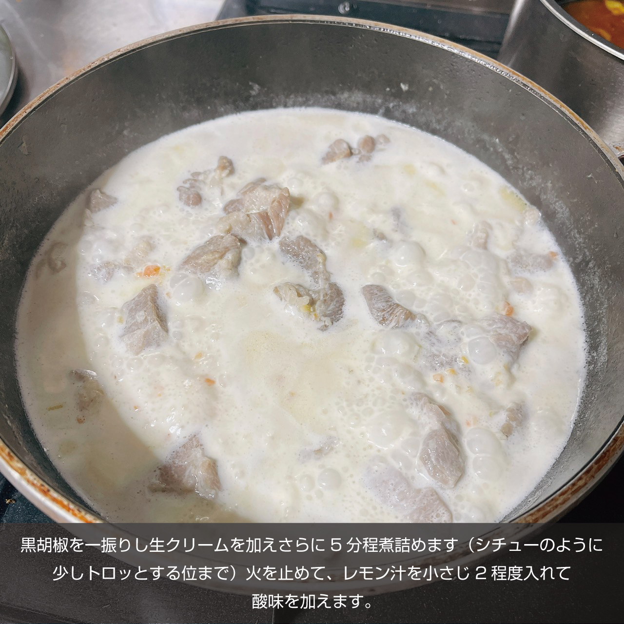 ⑦さらに5分程煮詰めます。黒胡椒を一振りし生クリームを加えさらに5分程煮詰めます(シチューのように少しトロッとする位まで)