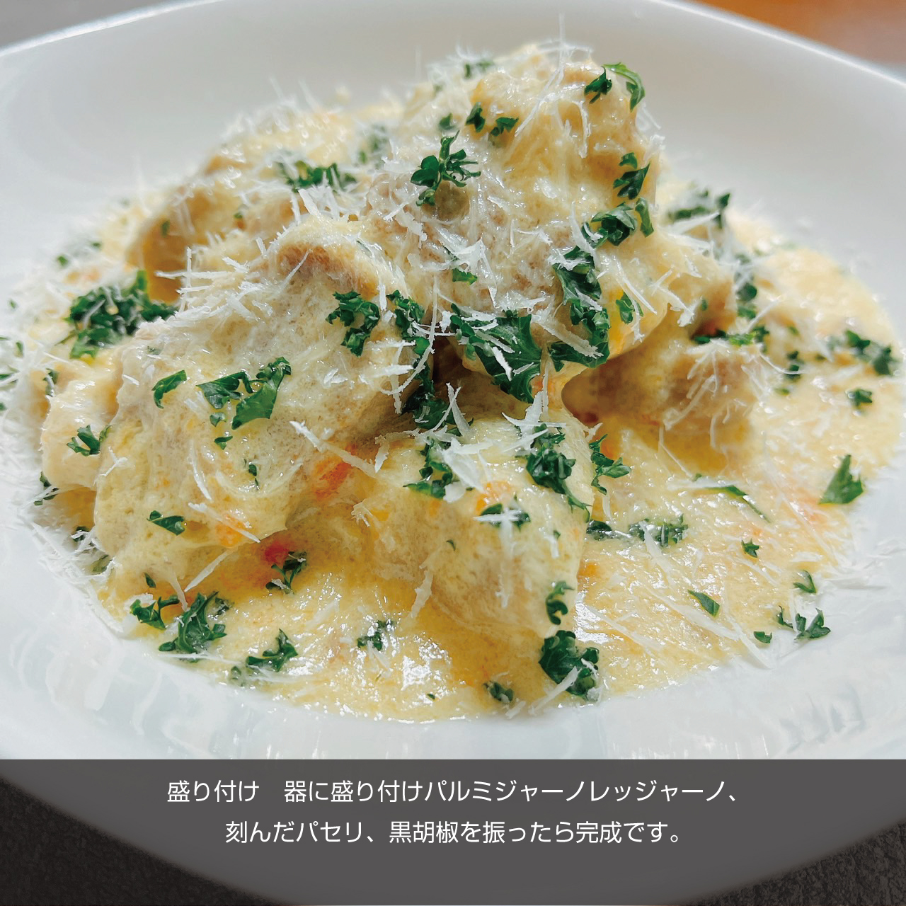⑨盛り付け 器に盛り付けパルミジャーノレッジャーノ、刻んだパセリ、黒胡椒を振ったら完成です。