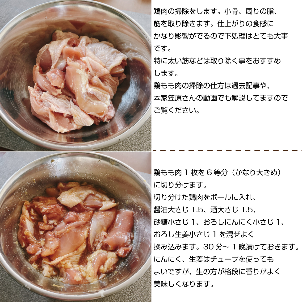 鶏もも肉の掃除の仕方は過去記事や、本家笠原さんの動画でも解説してますのでご覧ください。