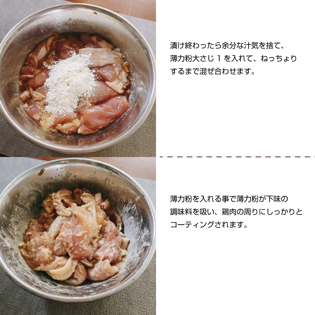 ③漬け終わったら余分な汁気を捨て、薄力粉大さじ1を入れて、ねっちょりするまで混ぜ合わせます。薄力粉を入れる事で薄力粉が下味の調味料を吸い、鶏肉の周りにしっかりとコーティングされ