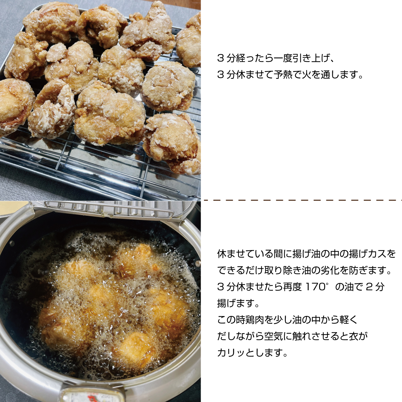 ⑥休ませている間に揚げ油の中の揚げカスをできるだけ取り除き油の劣化を防ぎます。3分休ませたら再度170°の油で2分揚げます。この時鶏肉を少し油の中から軽くだしながら空気に触れさせると衣がカリッとします。