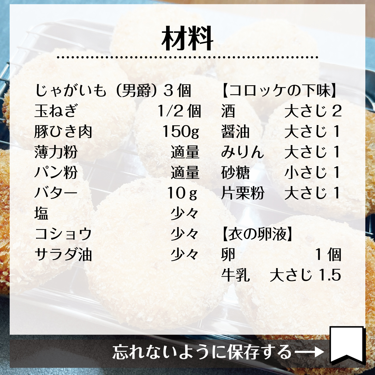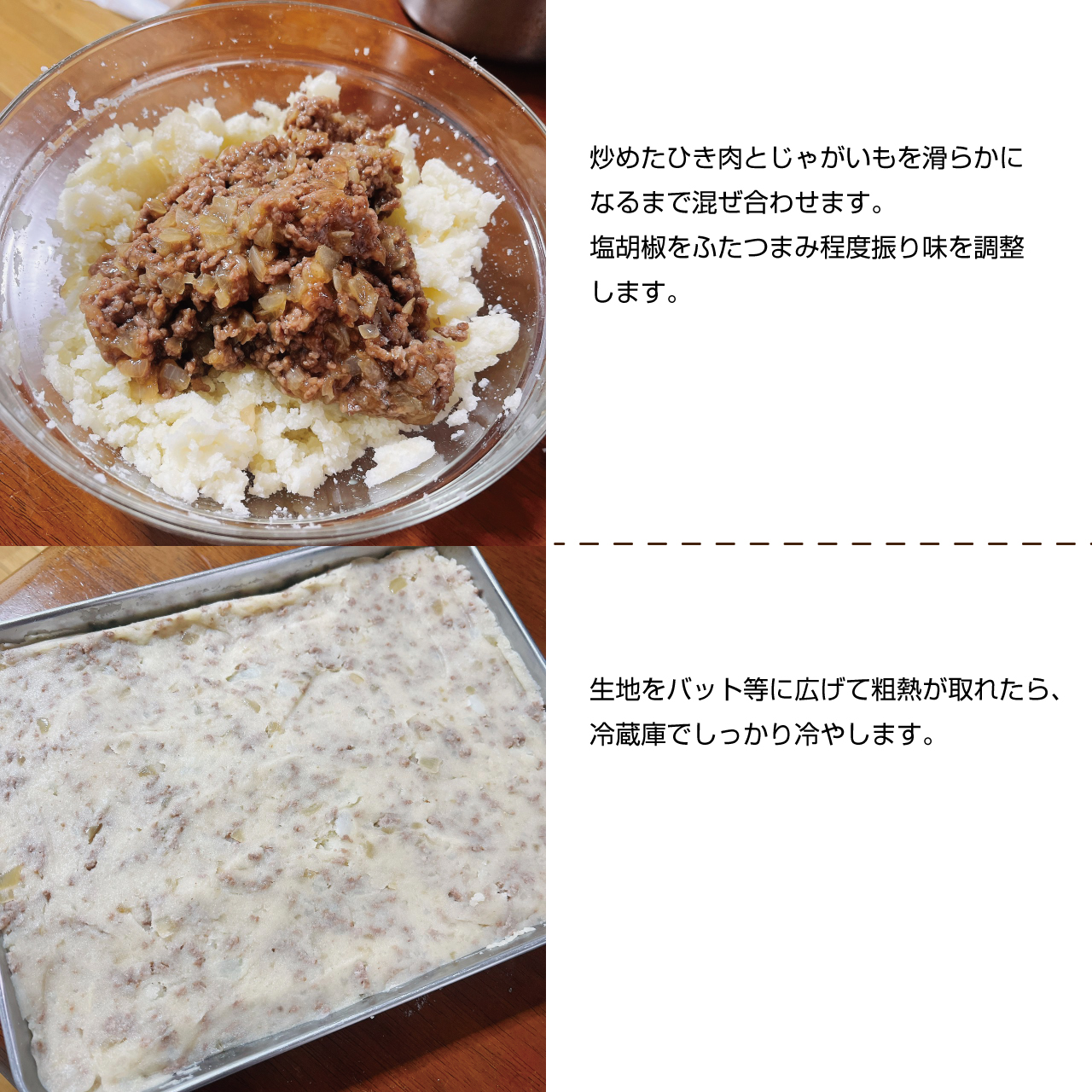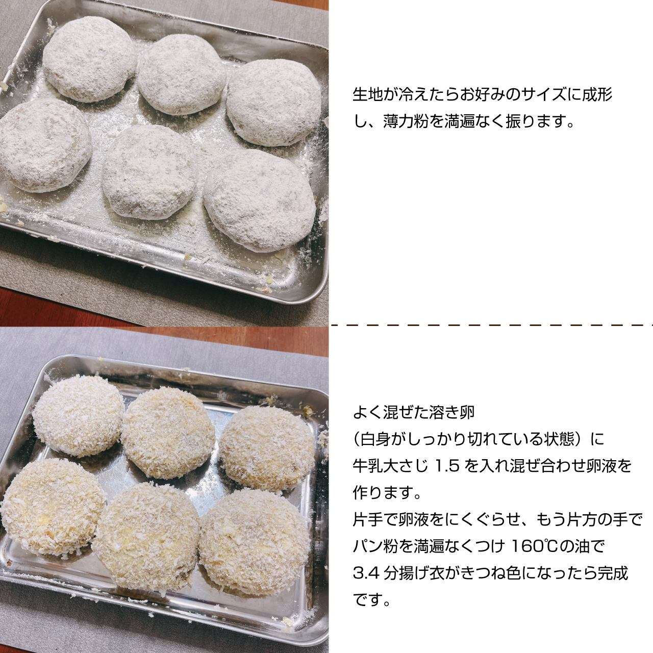コロッケは材料がシンプルなので、ひとつひとつの工程をしっかり行う事で、市販のコロッケにはないじゃがいも感、とクリーミー感が出ます。