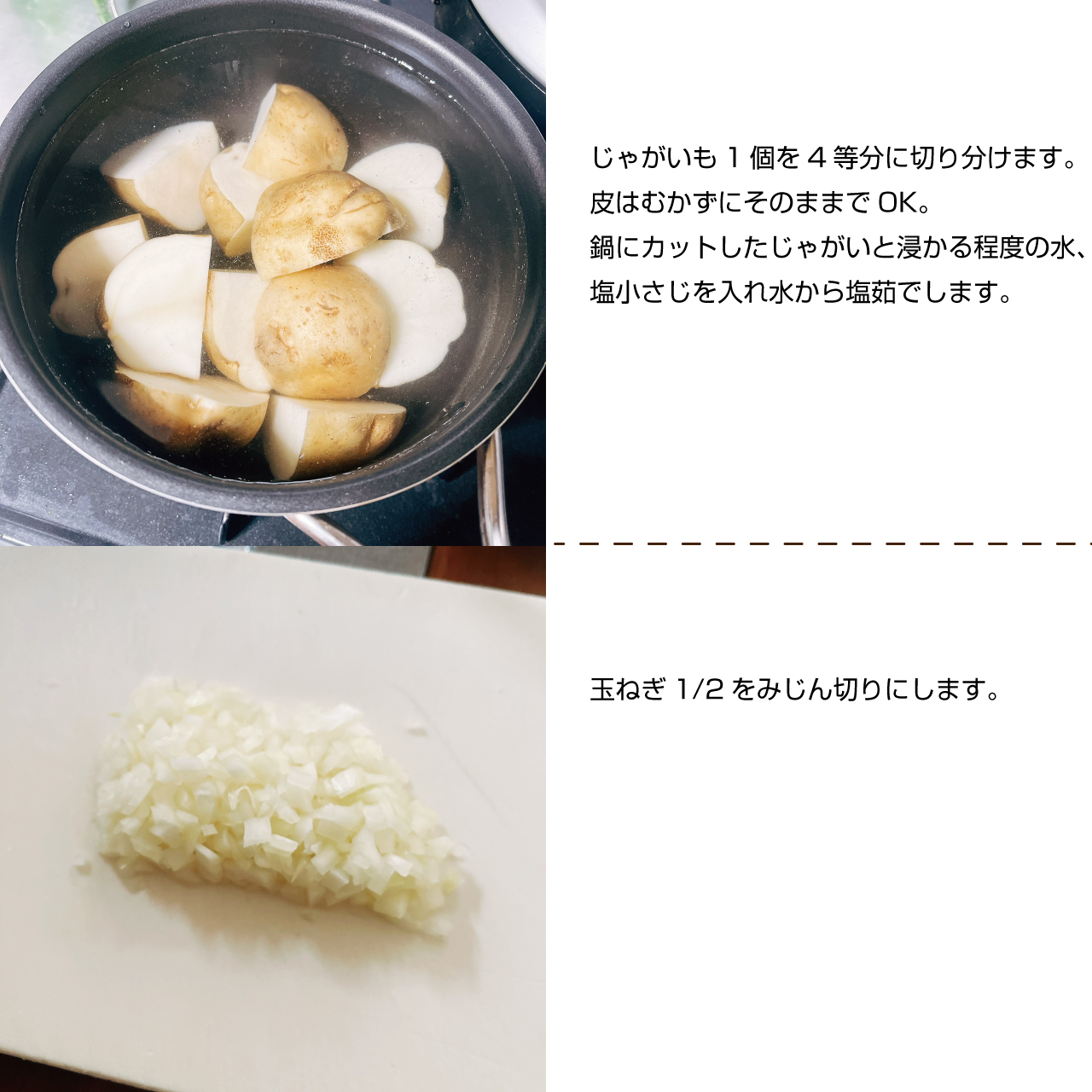 ①じゃがいも1個を4等分に切り分けます。皮はむかずにそのままでOK。鍋にカットしたじゃがいと浸かる程度の水、塩小さじを入れ水から塩茹でします。