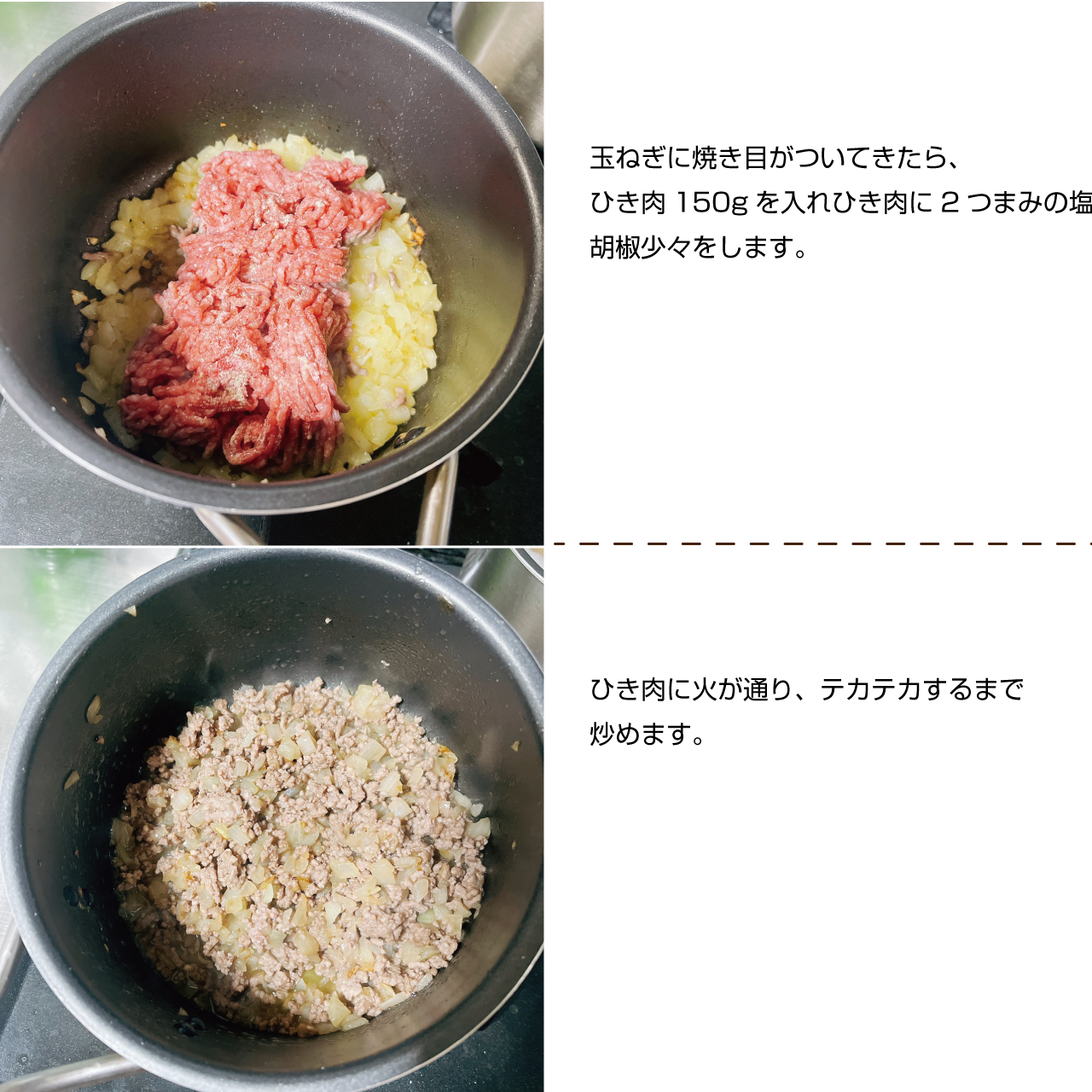 玉ねぎに焼き目がついてきたら、ひき肉150gを入れひき肉に2つまみの塩、胡椒少々をしひき肉がテカテカするまで炒めます。
