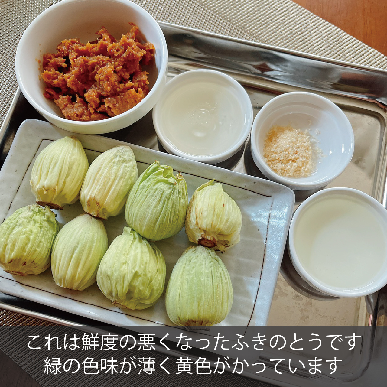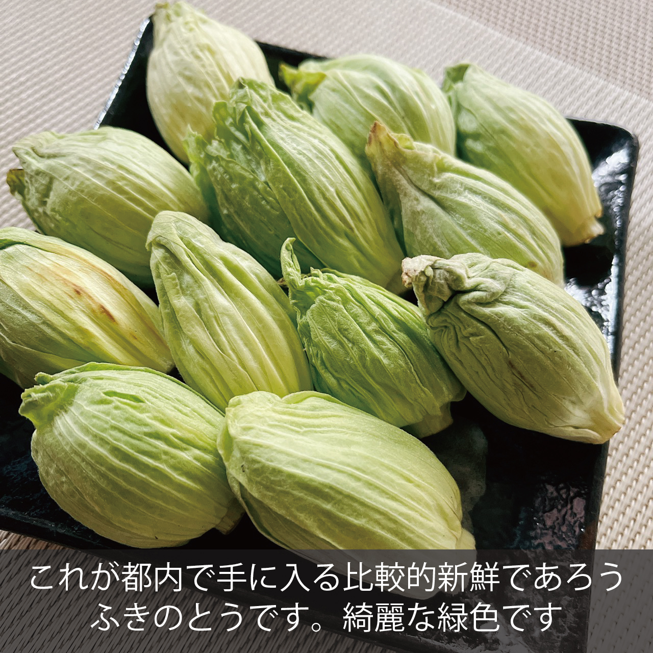・とにかく鮮度の良い緑色が強めのふきのとうを選んでください。写真にある通り、しおれたものや黄色がかっているものは少し古くなったふきのとうなので注意です。