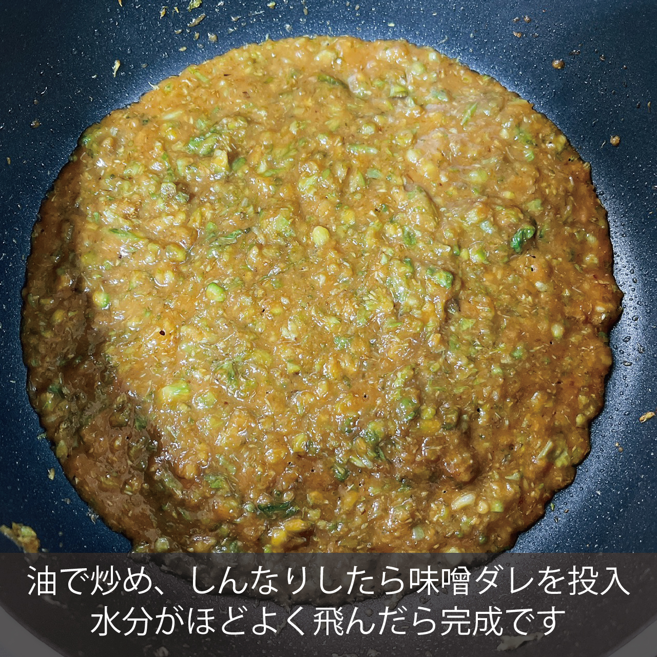 ❹みじん切り終わったら、フライパンの火力を強くし投入します。油に馴染むように混ぜ合わせふきのとうがしんなりしてきたら味噌ダレを加えます。