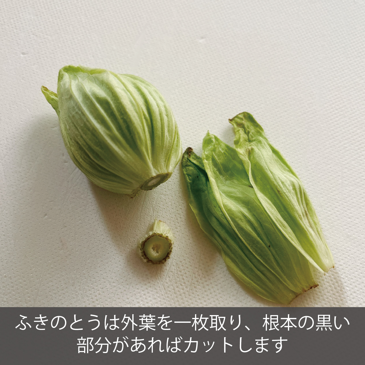 ❶ふきのとうは外葉が硬くて黒ずんでいるものや付け根が黒く変色している部分があれば取り除きます。