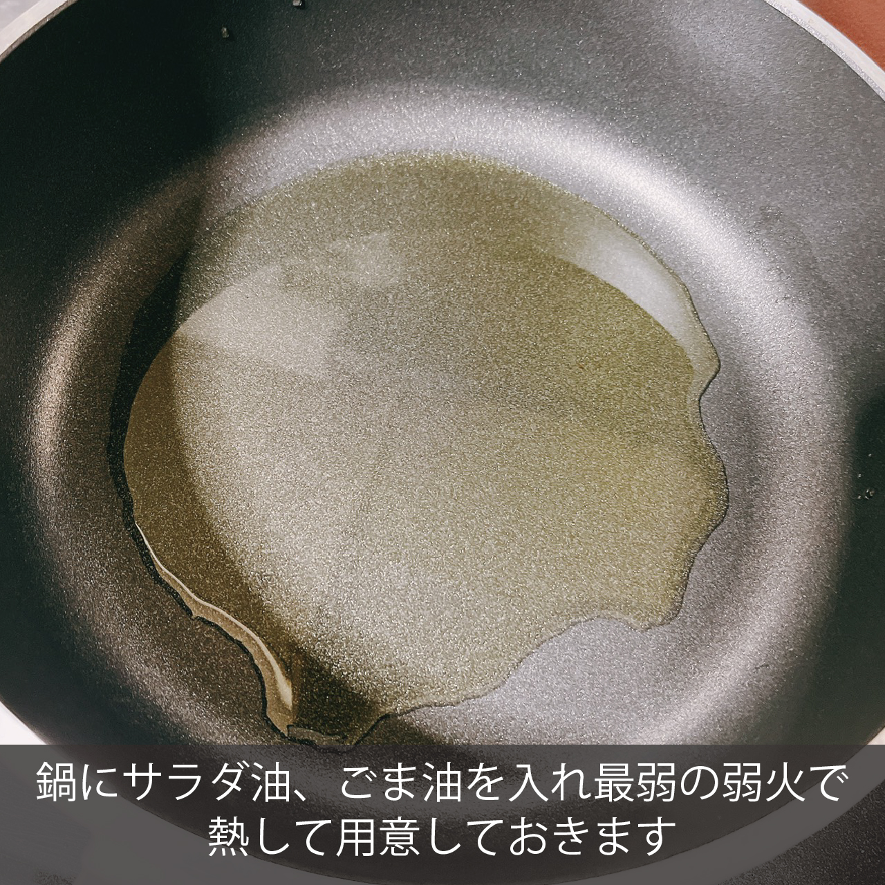 ❷ふきのとうは刻むとすぐにアクが回るので、刻んだらそく炒める必要があります。その為事前にフライパンに油を入れ弱火で熱しておきます。