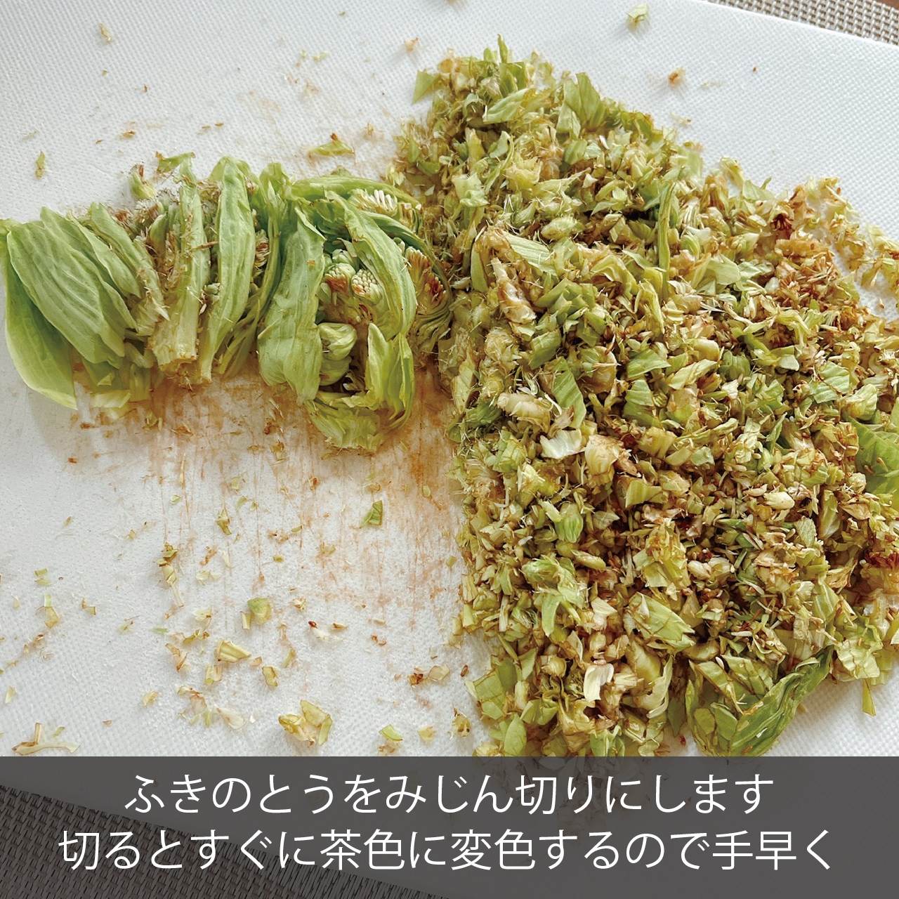 ❸ふきのとうは外葉が硬くて黒ずんでいるものや付け根が黒く変色している部分があれば取り除き、みじん切りにします。