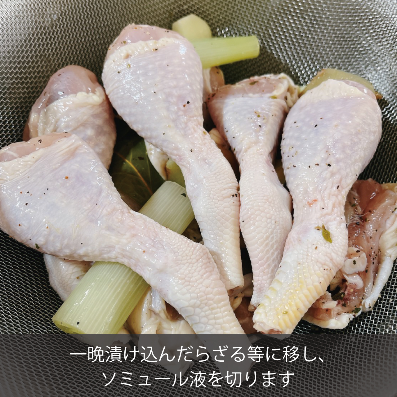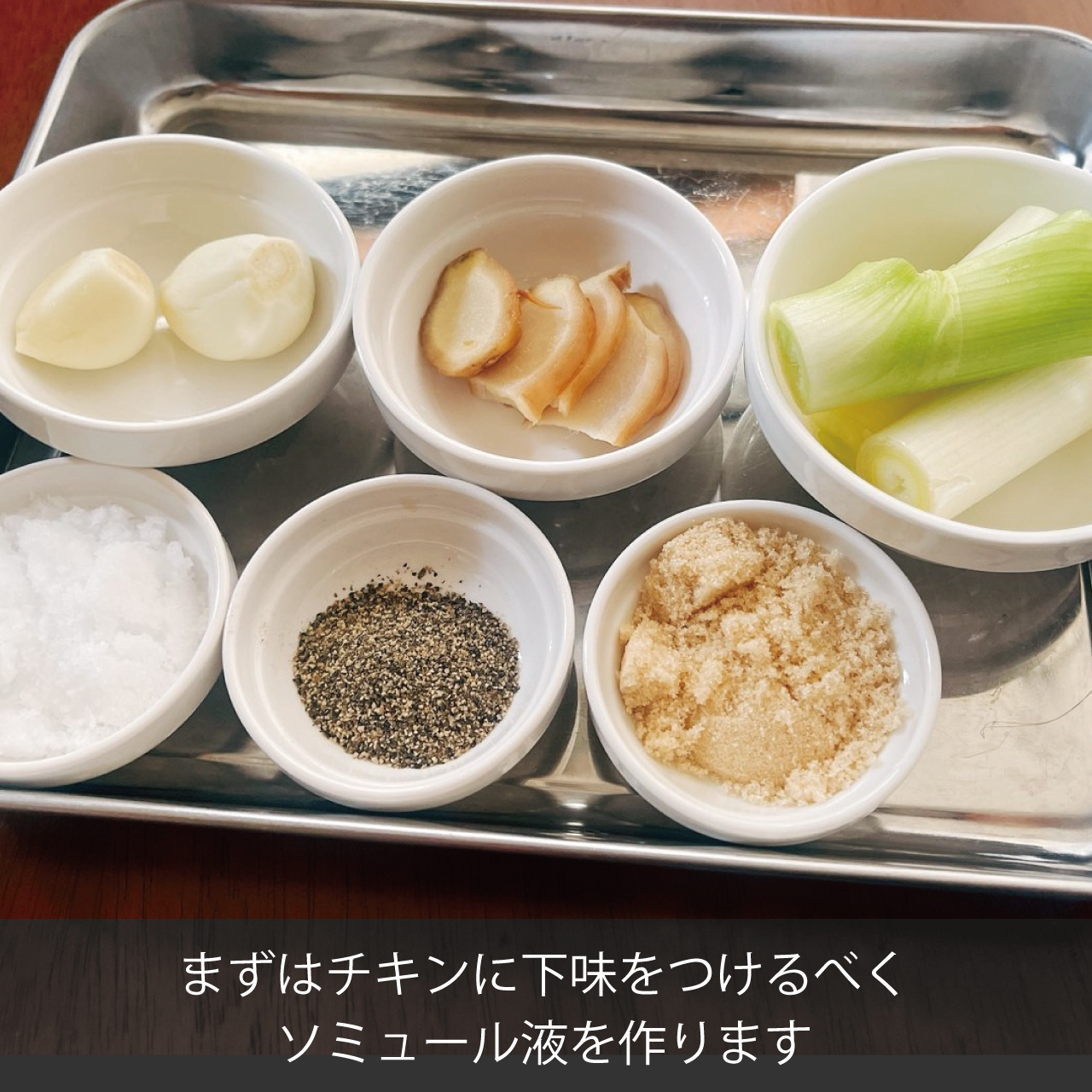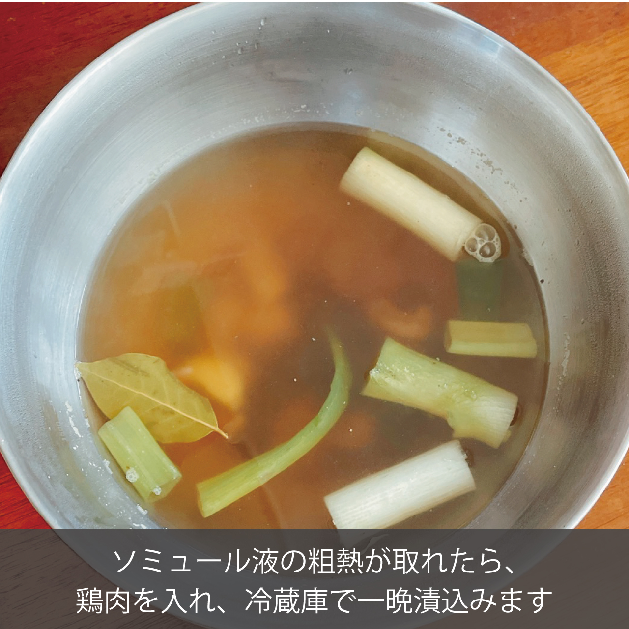 ソミュール液に漬け込む事で、野菜の旨味とスパイスの風味をチキンに漬け込む。また肉のパサツキを防止しジューシーな仕上がりになる。