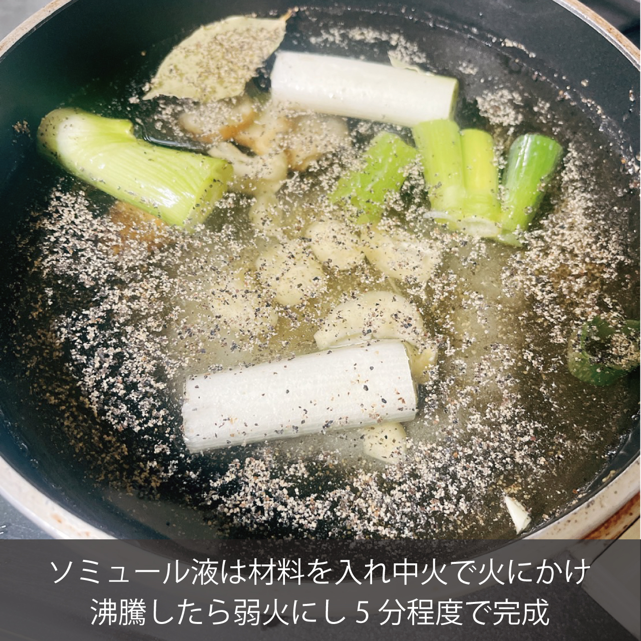 鍋にソミュール液の材料を全て入れ中火で沸騰させる。沸騰したら弱火にしさらに5分加熱する。粗熱が取れたら完成