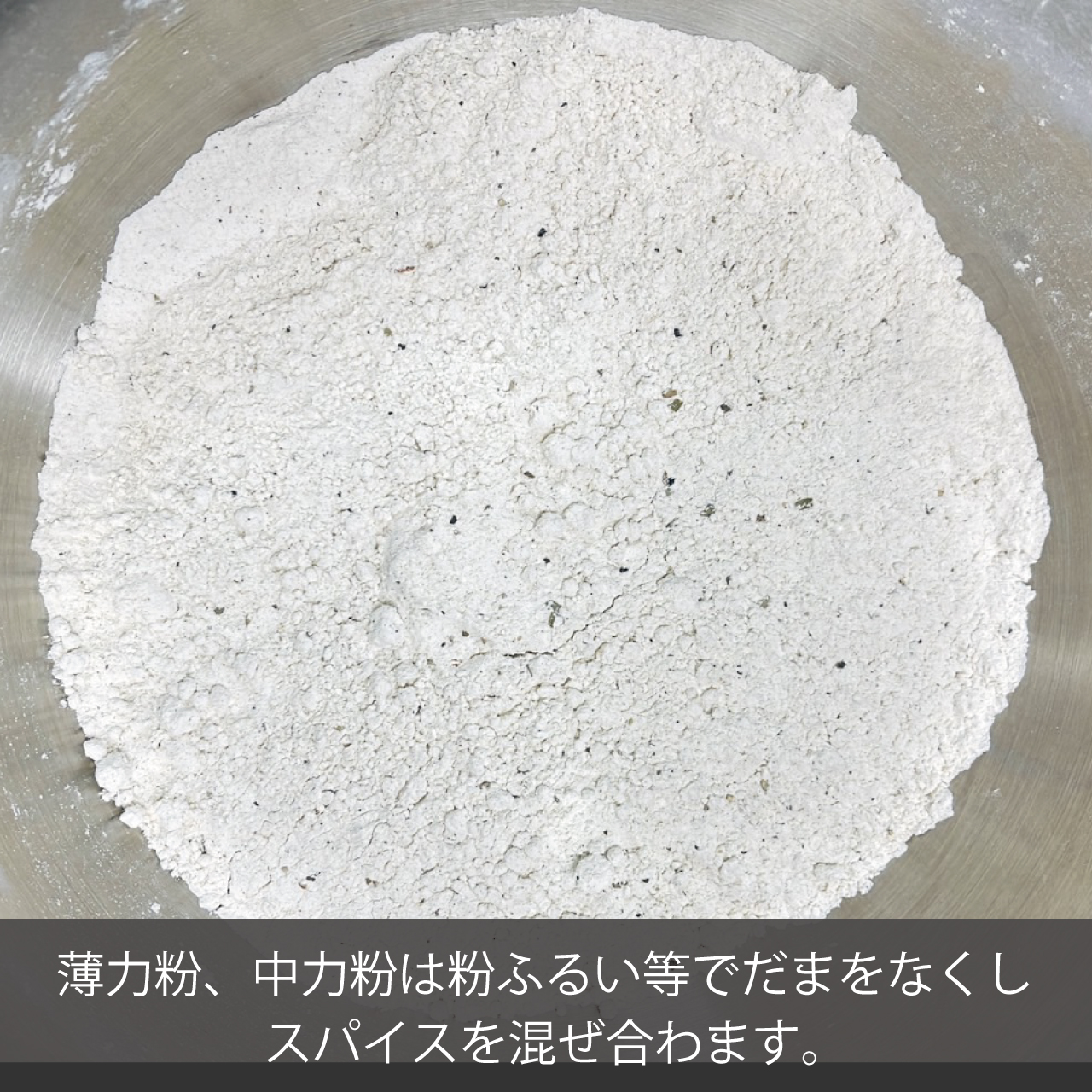 ① 薄力粉、中力粉は粉ふるいにかけるとだまができずらく、肉に粉を付けやすく衣が剥がれにくくなるので粉ふるいにかける。
