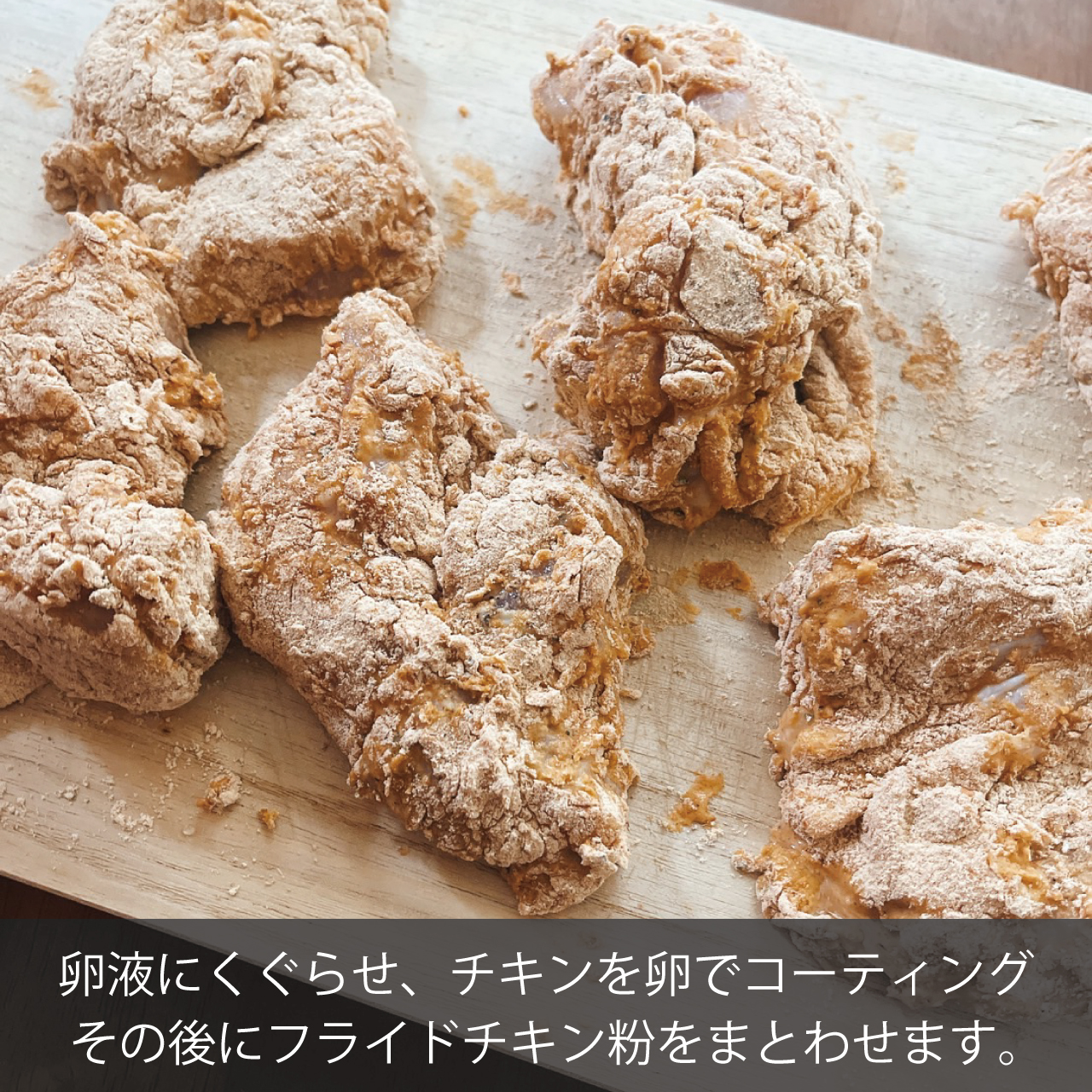 卵液にくぐらせたチキンを次はバット等に入れたフライドチキン粉を満遍なく付ける。
