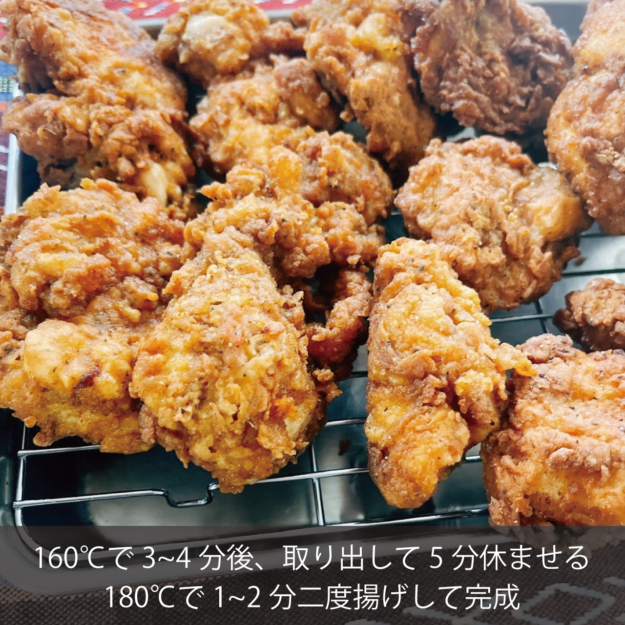 ②のチキンを160℃で3~4分揚げたら、取り出し5分休ませる。その後180℃で1~2分二度揚げし表面をパリッとさせる。