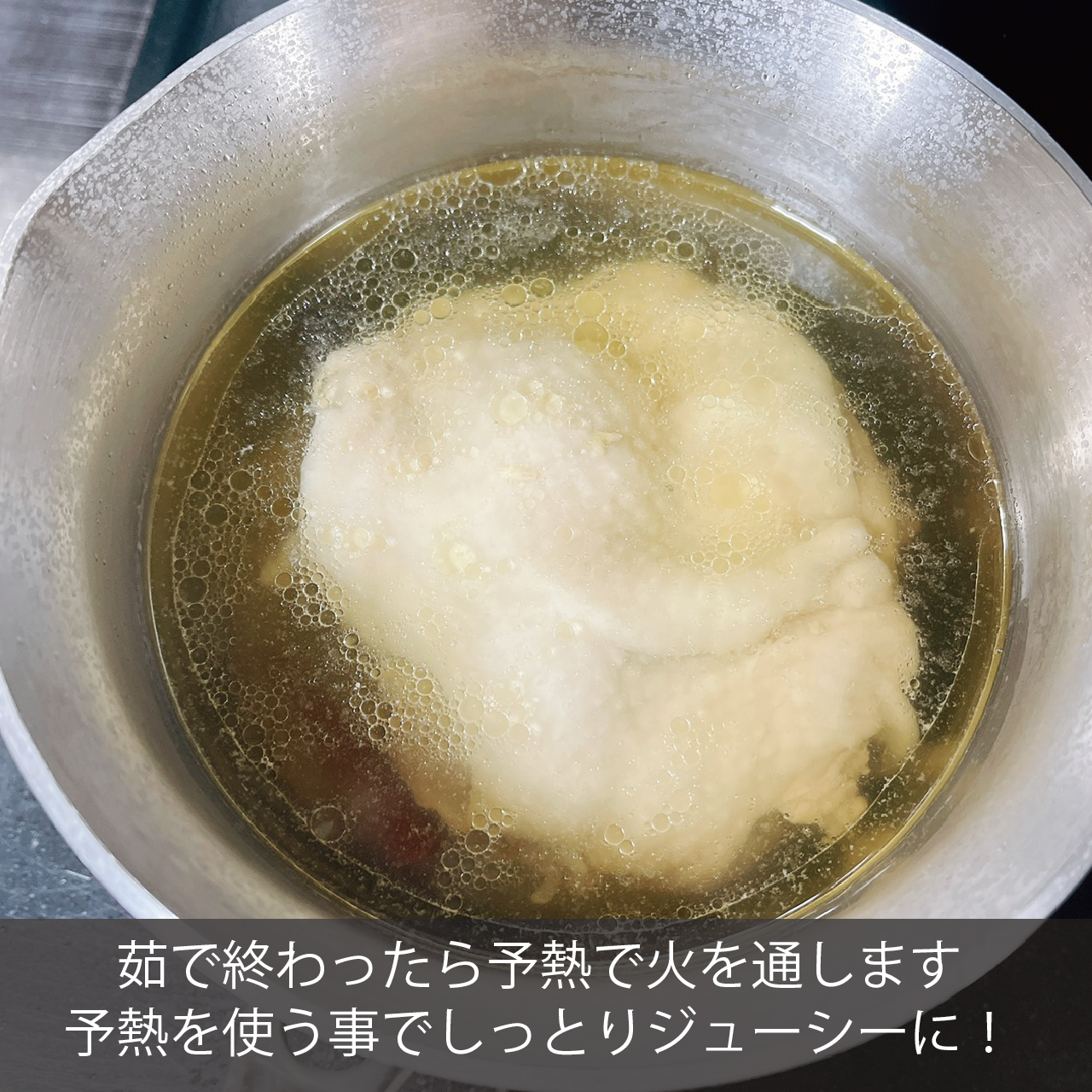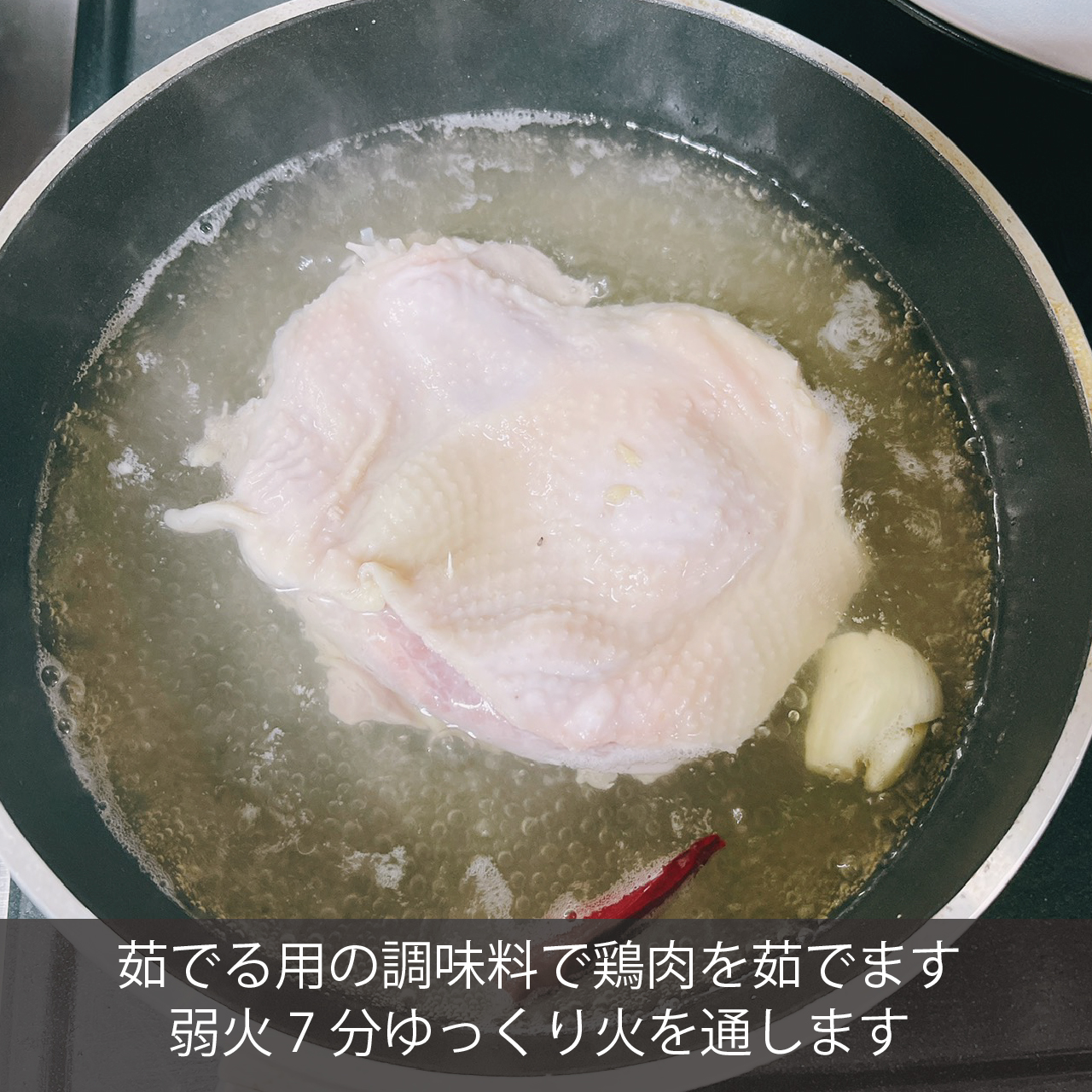 ❶鶏肉を茹でる 鍋に水500mlとゆで鶏、調味料を全部入れてから火にかけます。沸騰したらアクをとり、弱火でコトコト7分程度茹でます。7分たったら火を消しそのまま予熱火を通します。予熱で火を通すので、火加減は弱火で