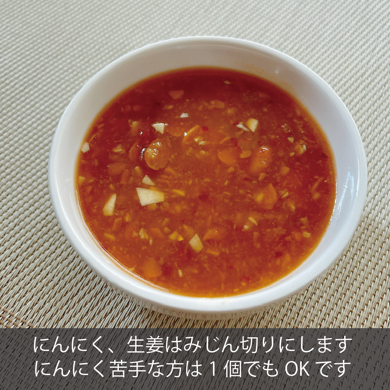 ❷特製だれ 生姜、にんにくはみじん切りに、鷹の爪は輪切りにしてたれの材料と混ぜます。味見をして辛味、にんにく、チリソースの量をお好みで調節してください。