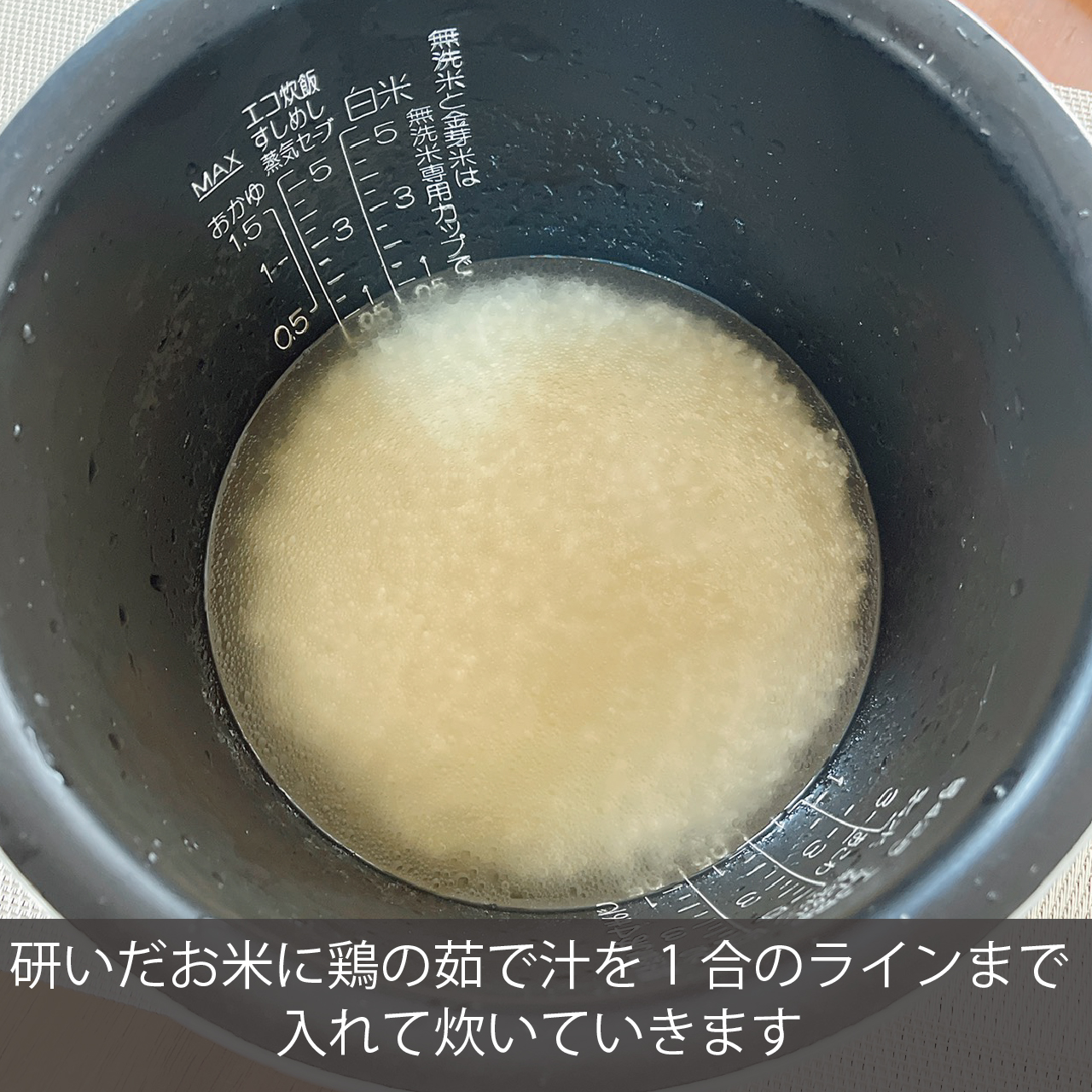 ❸米を研ぎ❶の茹で汁を1合のラインまで入れ炊きます。
