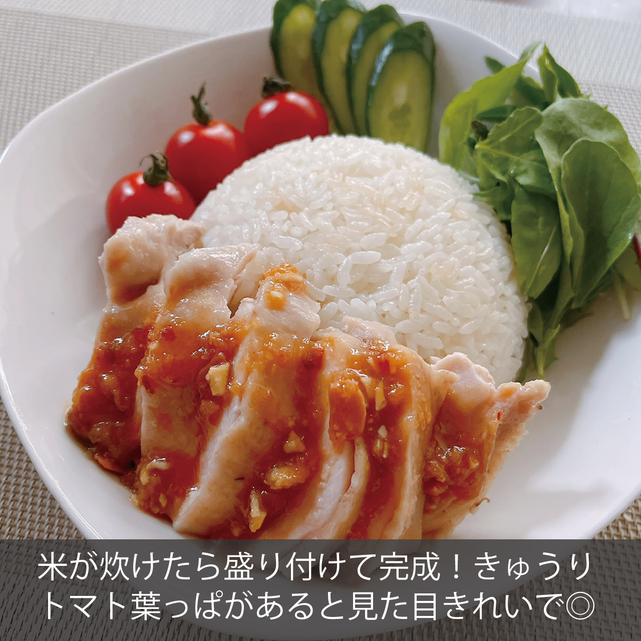 ❹炊きあがったら、鶏を切り分け、ご飯、きゅうり、ミニトマト、ベビーリーフ等で飾り❷のたれをかけて完成です。