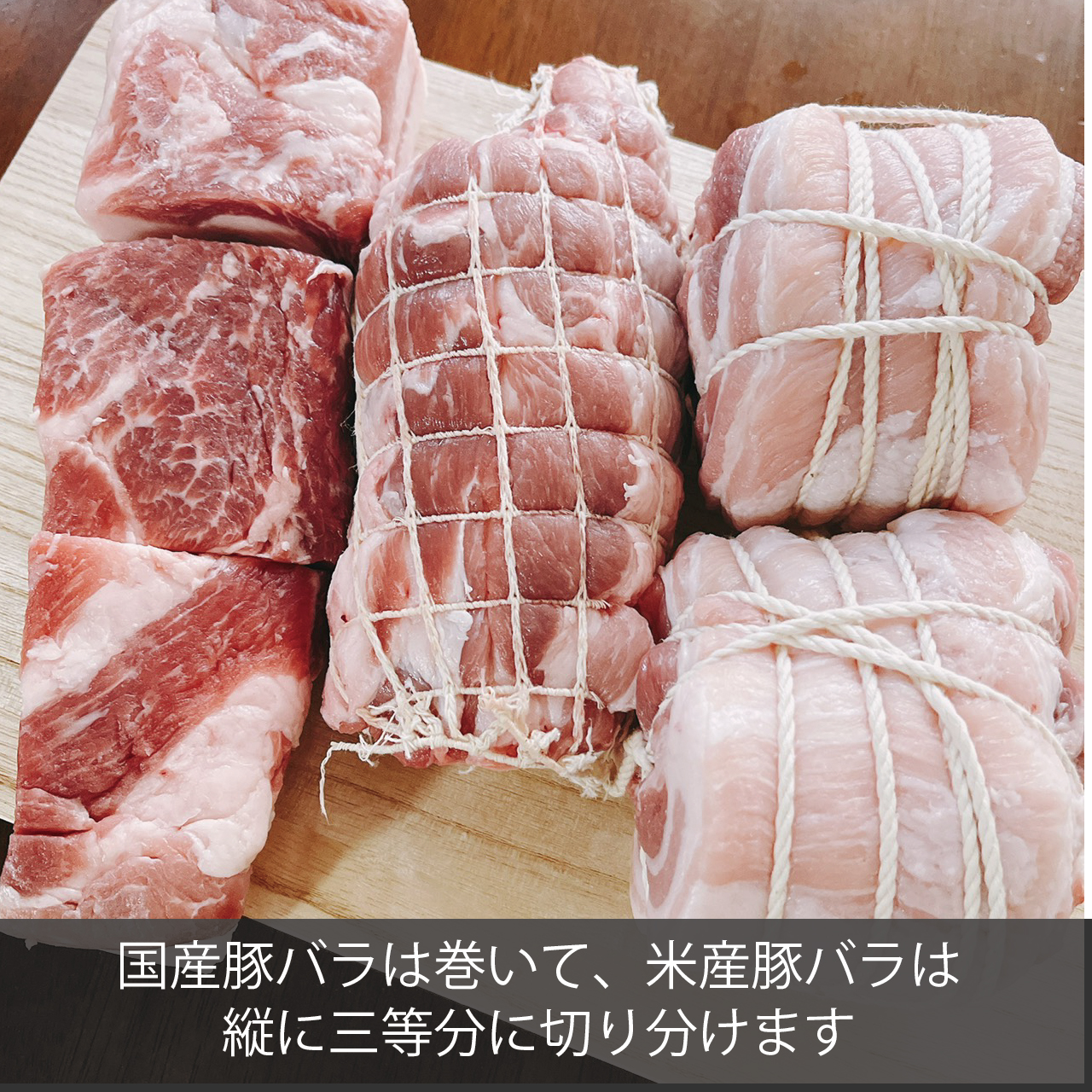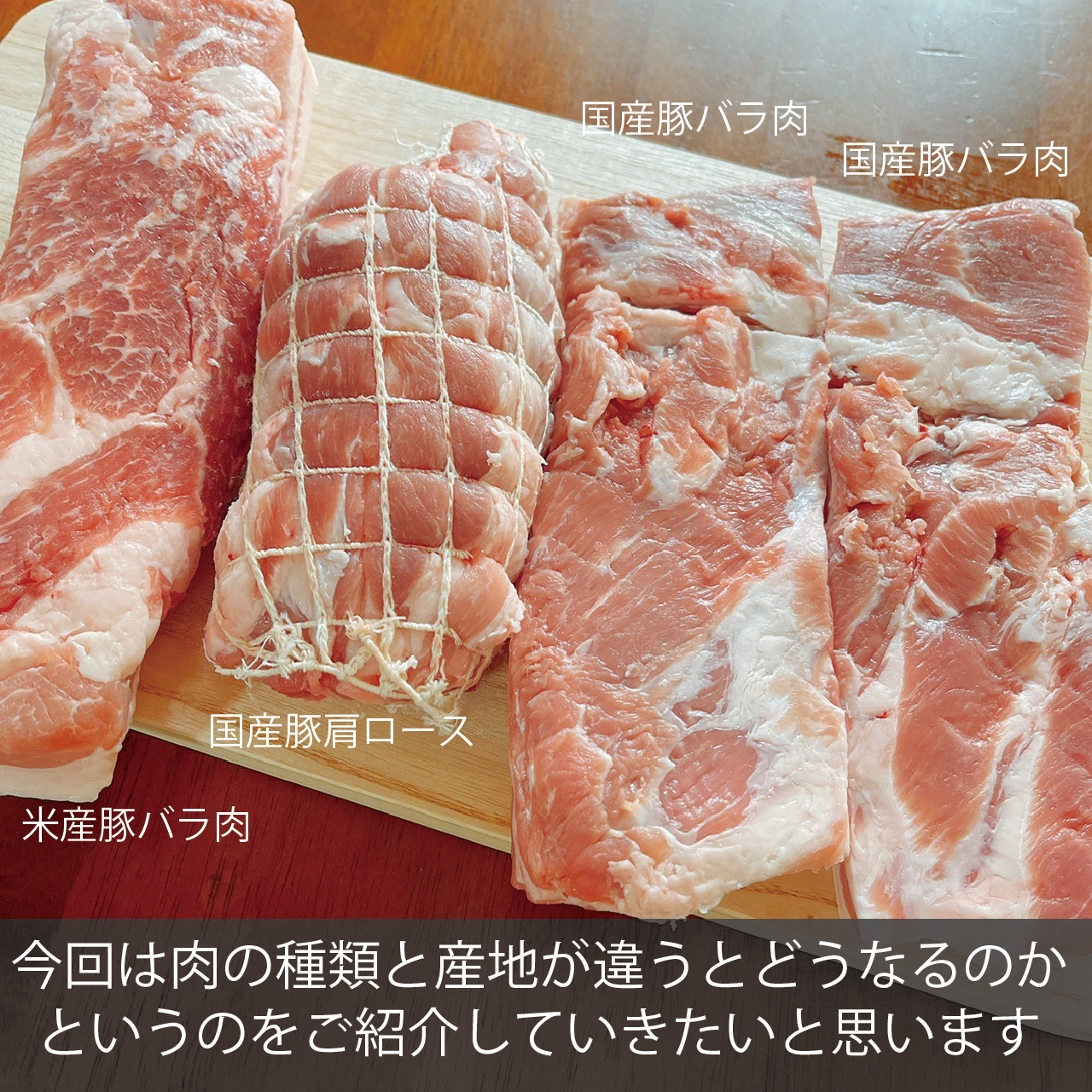 ③部位は【国産豚肩ロース肉】【米国産豚バラブロック肉】【国産豚バラブロック肉】の3種で比較してみました。