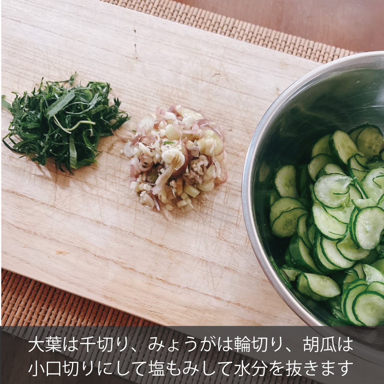 きゅうりは両端を落とし小口切りにした後、塩小さじ1/2をふり(きゅうり2本に対して)塩もみし5分から10分程度時間を置きます。十分に水分が抜けたら、ぎゅっときゅうりの水分を絞ります。