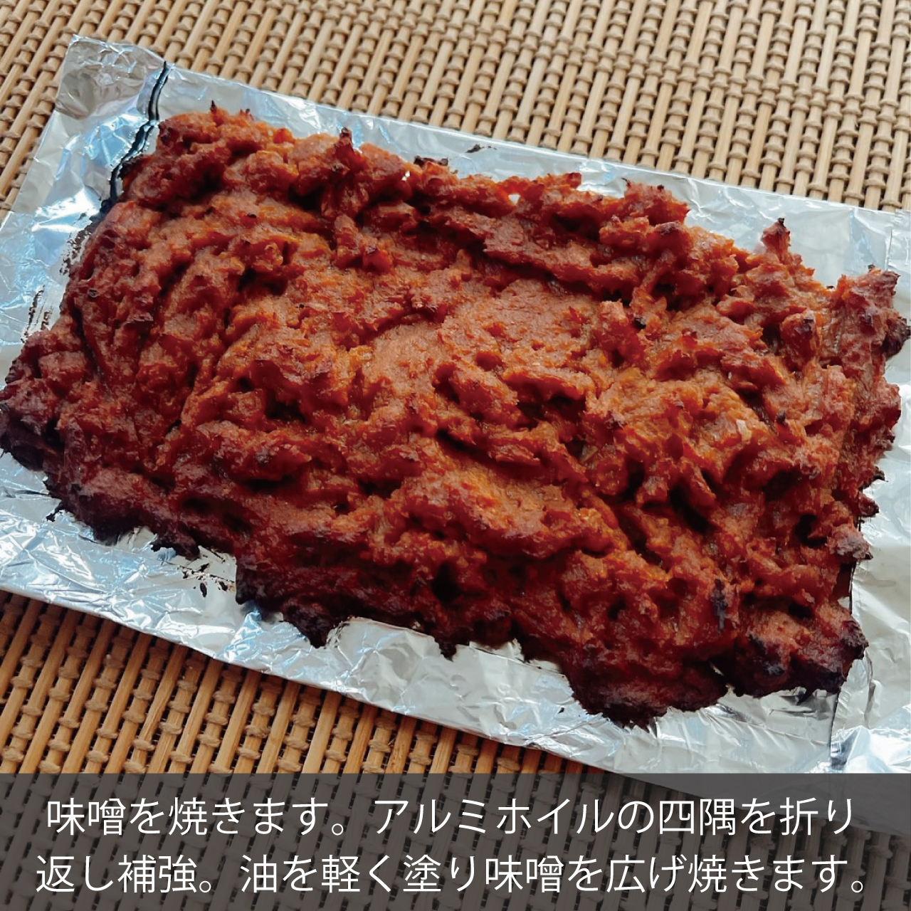 アルミホイルにサラダ油を軽く塗りそこに味噌を広げこんがりと焦げ目がつくまで焼きます。トースターなどで焼く場合は途中から一気に焼け焦げる場合があるので注意が必要です。