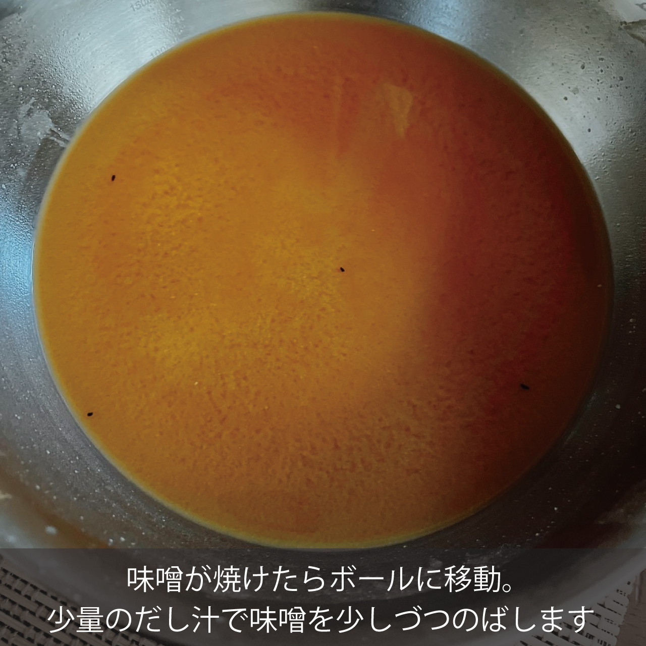 どんな料理かというと、昆布とかつお出汁に香ばしく焼いた味噌を溶かし入れます。ここまでは完全に味噌汁ですね。