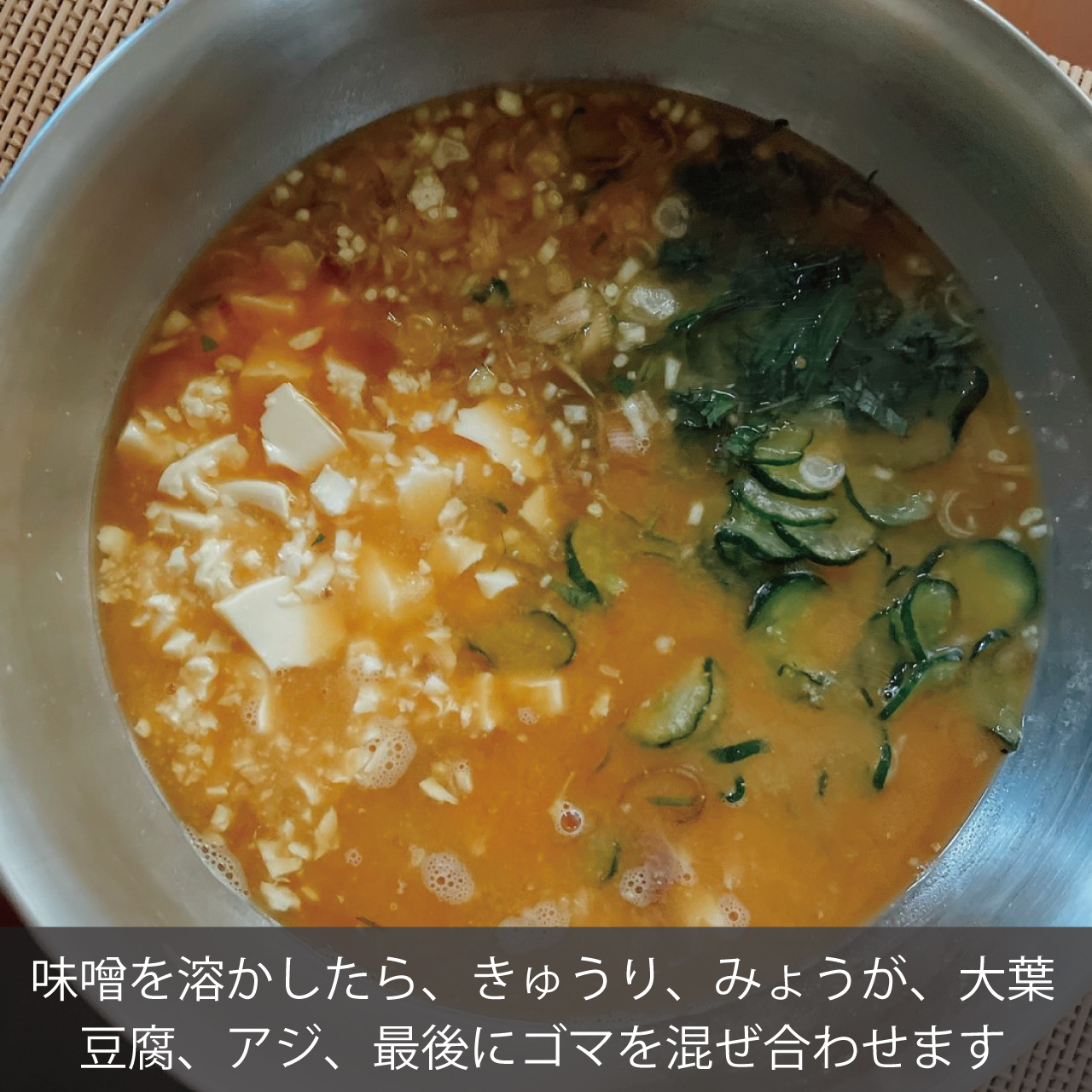味噌を大きめのボウルなどに入れ、冷たい少量のだし汁で少しづつのばします。だし汁が全部入り味噌が十分に溶けたら、ほぐしたアジの干物、絞ったきゅうり、みょうが、大葉を入れます。豆腐は小さく手でちぎりながら入れます。