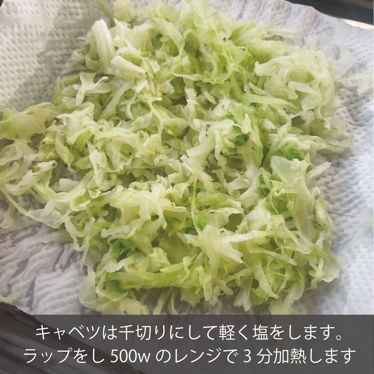 パンに挟む千切りキャベツは軽く塩をふってからレンチンすることにより無駄な水分を出します。これによりソースの味がぼやけないようにしたり、保存性の向上が見込めます。
