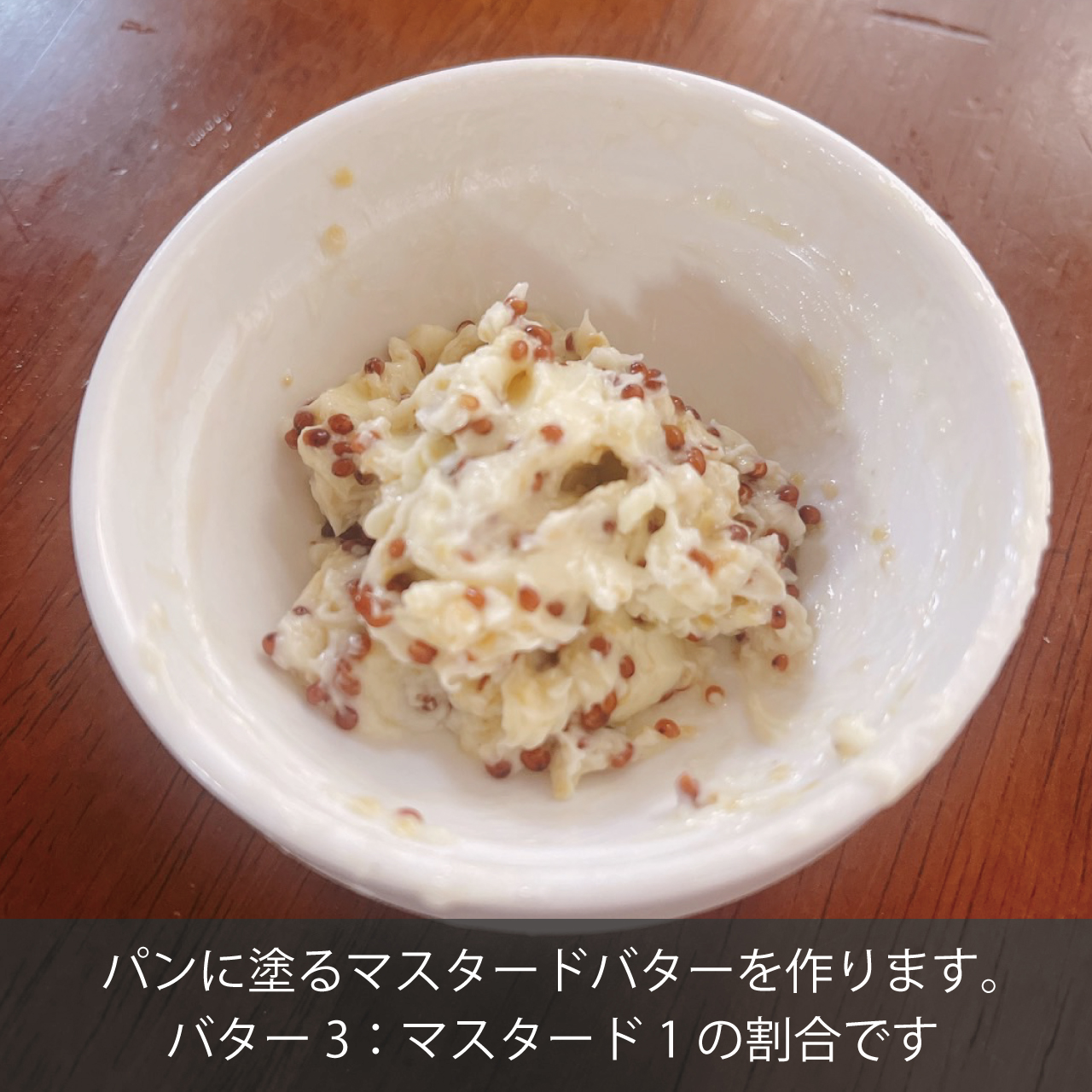 このマスタードバターはパンに塗る用のバターです。バター3に対してマスタード1の割合で混ぜ合わせます。バターは常温に戻しておかないと混ぜにくいので事前に常温に戻しておくと◎です。