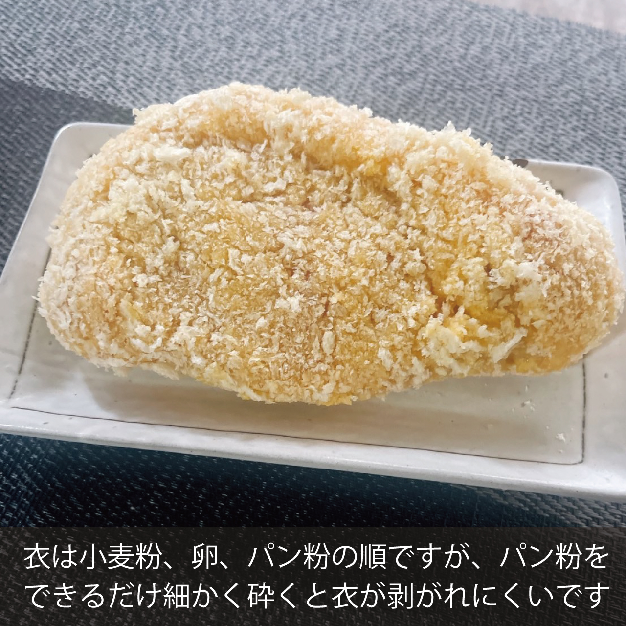 最初に小麦粉、卵、パン粉の順につけていきます。卵につけた後パン粉を付けますが、卵液が指に付いているとパン粉の所に、ダマができやすいので、卵液につけ、パン粉に入れた時は直接指は入れずボールやバットを揺するようにしてパン粉をつけるとよいです。